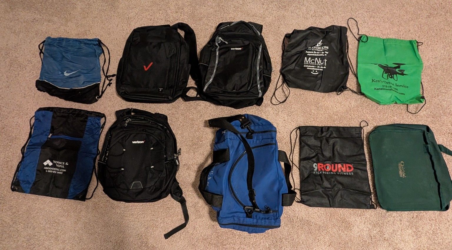 Moving soon — priced to sell. First pickup takes it. Bulk bundle of bags — great for work, gym, travel, or storage Includes: • 3 Verizon laptop backpacks (work/bookbag style) • 1 duffle bag • 5 drawstring bags (including 1 Nike) • 1 green briefcase-style bag with 3-ring binder included All bags are in good usable condition. Selling as a bundle only to clear space. Pickup: Downtown Cary Payment: Cash, Zelle, or Venmo First come, first served. $30 takes all.