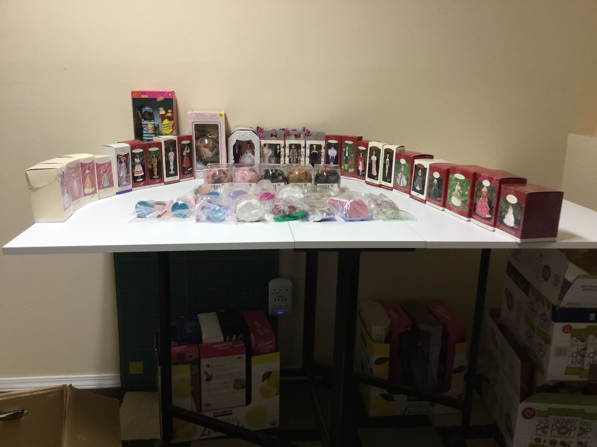 Selling Barbie collection - 47 dolls, 1 Christmas topper, 20 Hallmark ornaments and 23 miscellaneous Barbie items. Total of 91 items. All items new in box. 1 Christmas Barbie and 1 Bride Barbie box yellow with age. Tiffany Barbie box has water damage. Will not separate, must take all. No Shipping, only local deliveries.n