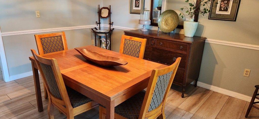 Solid Teak Dining Room Table with Chairs & Leaf Extension