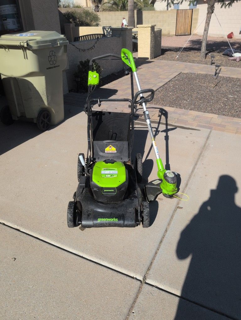 used electric corded greenworks 27-in electric lawn mower still works great. always works when you need it. also throwing in a greenworks weed wacker corded Cash only. all sales are final