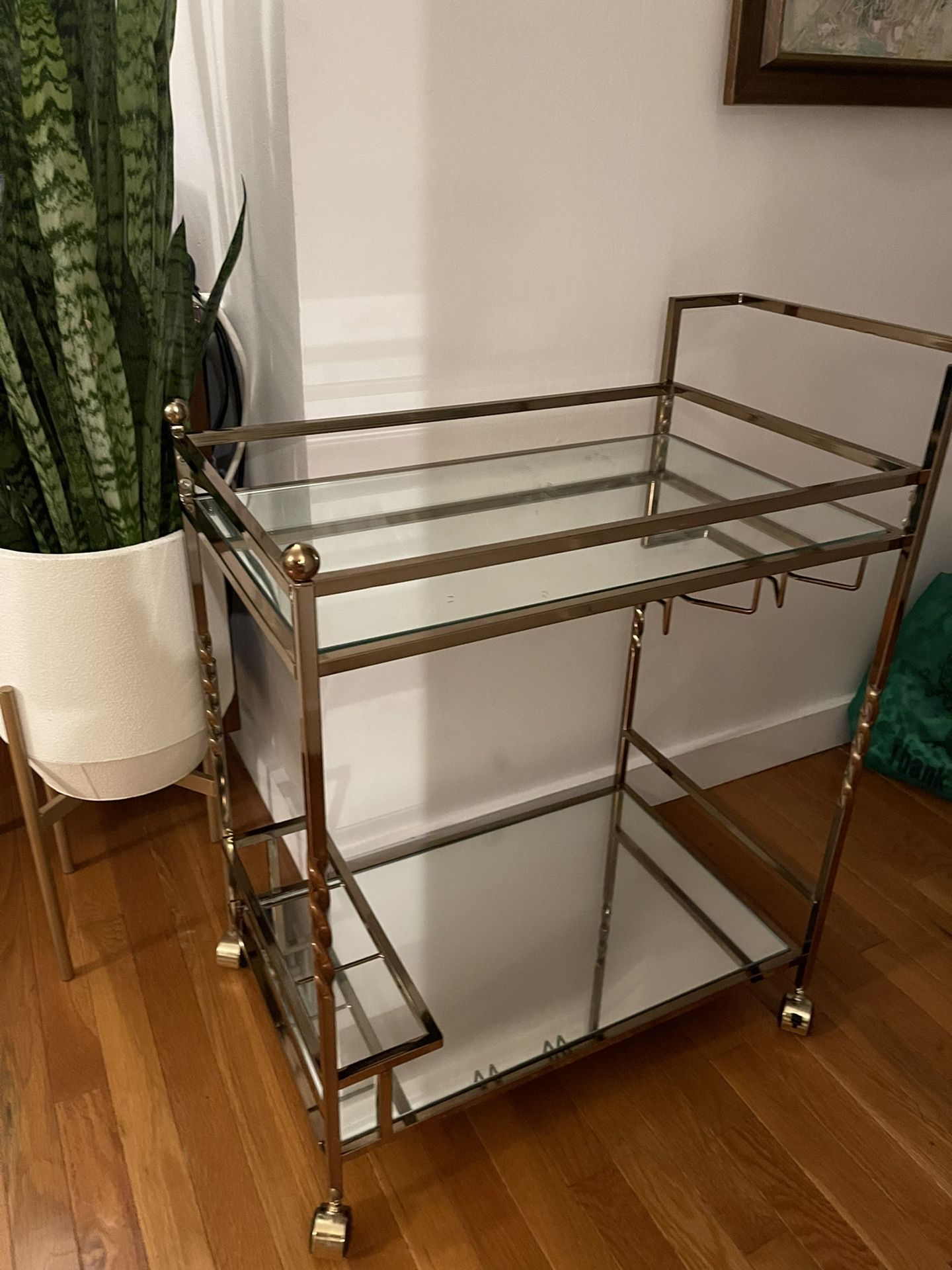 I love this bar cart but my baby can not stay away and we could use extra space. It's really nice and on wheels with a lock. Can store wine glasses and other stem glasses with two rows.