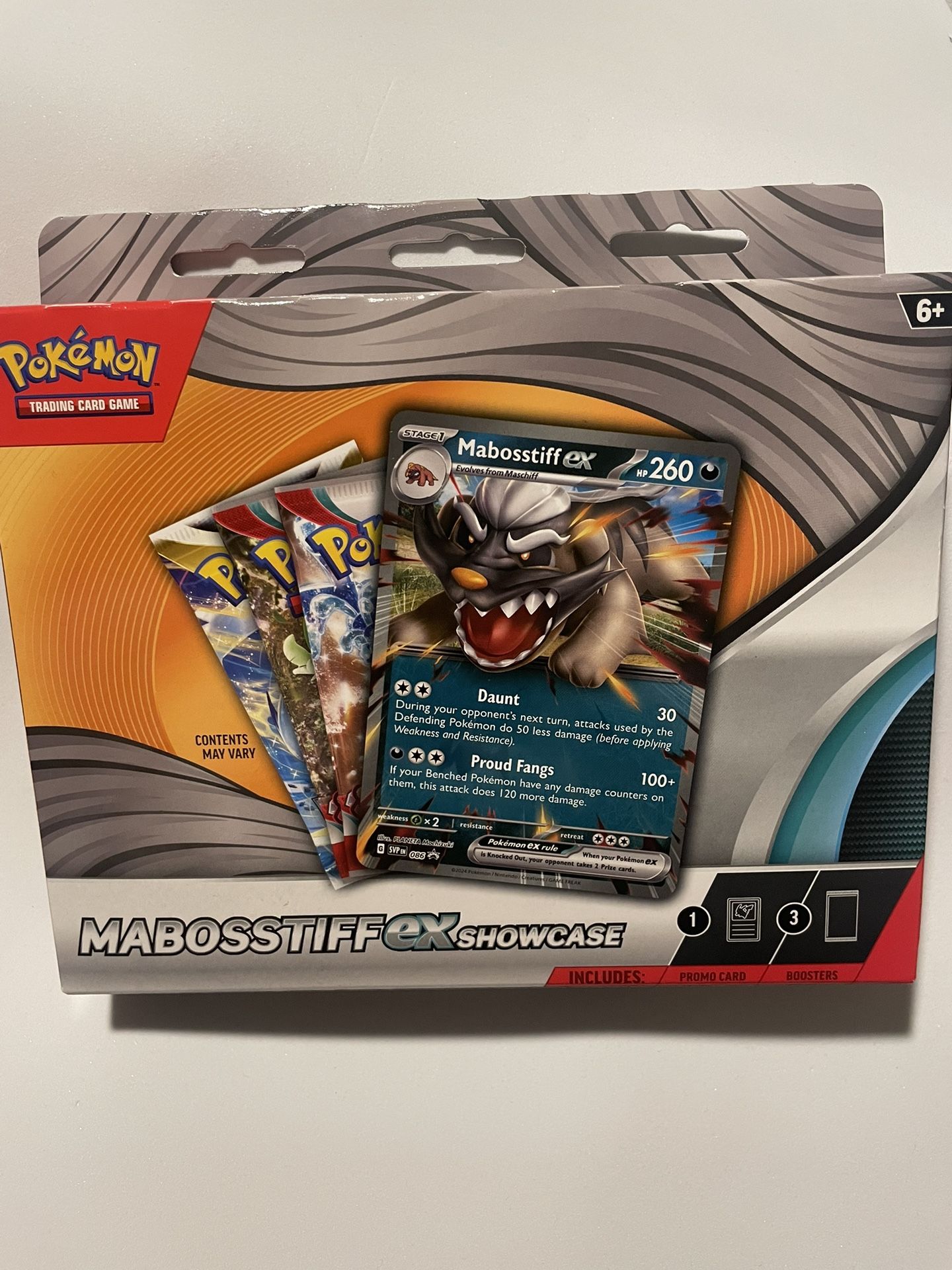 Pokémon TCG Mabosstiff ex Showcase box in new, sealed condition. This showcase set includes one foil promo card featuring Mabosstiff ex, three Pokémon TCG booster packs (contents may vary), and one code card for Pokémon TCG Live.