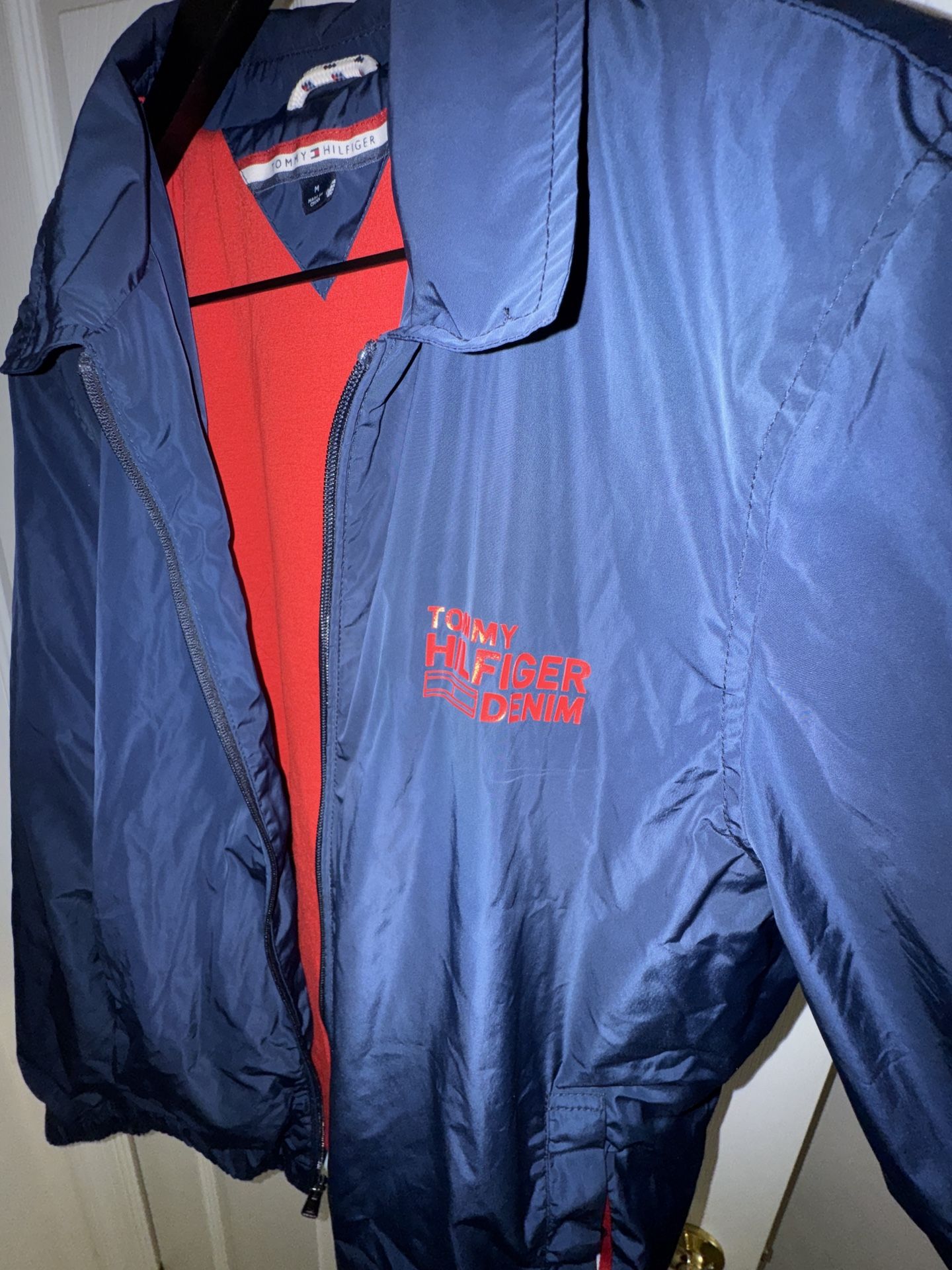 For sale is a stylish Tommy Hilfiger Denim windbreaker jacket in men's size medium. The jacket is in good, pre-owned condition with only a few wears. It features a classic navy blue color, a bold "Tommy Hilfiger Denim" logo on the chest, and the iconic red, white, and blue stripe on the back. It's a great lightweight jacket for a cool day or a casual night out
