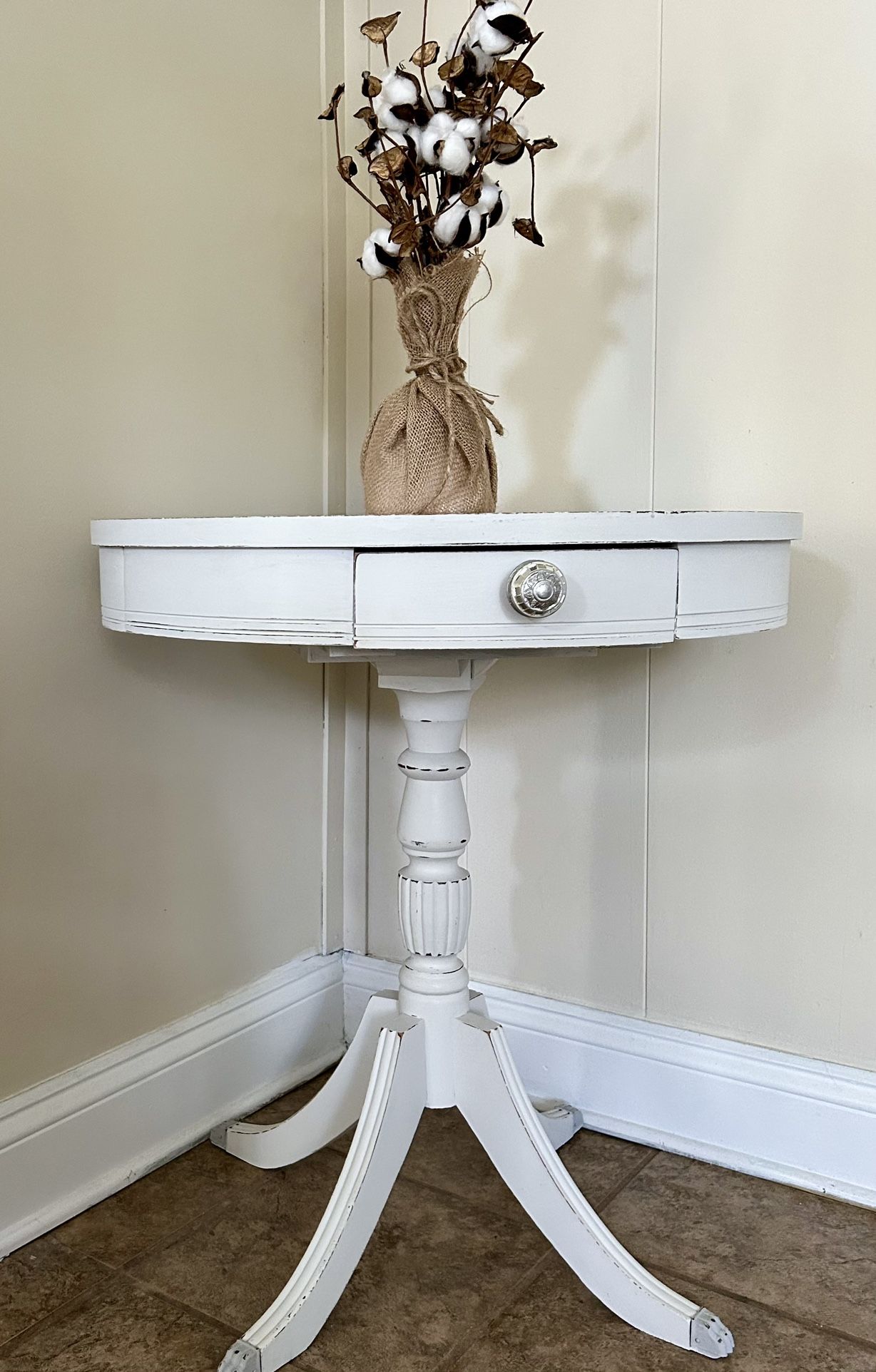 Cute drum table done in white and added a cute silver knob to the drawer. It measures H 27 1/4” W 24 round .