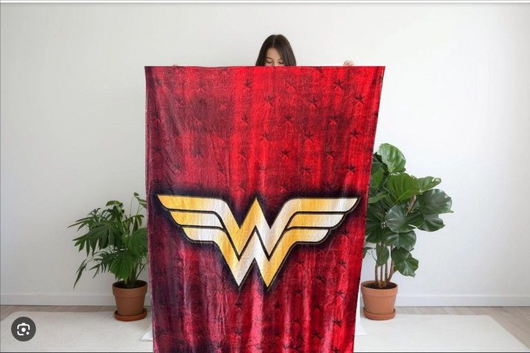 This is a Wonder Woman themed fleece throw blanket that measures 60 inches in length and 50 inches in width. The blanket is burgundy in color and features an all-over Wonder Woman pattern. It is designed for use in the bedroom and is ideal for fans of the Wonder Woman character.