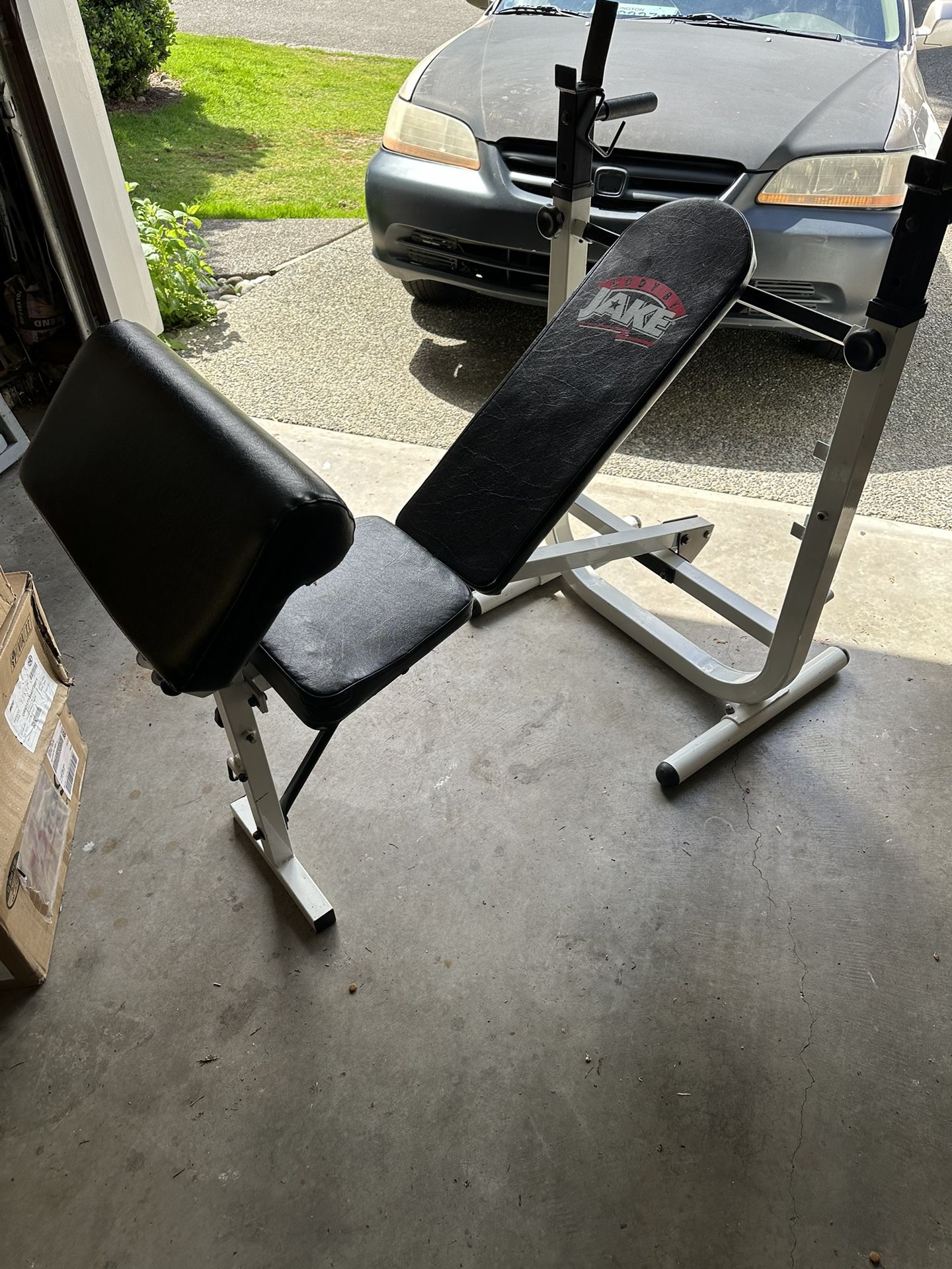 The bench is adjustable to incline press. It comes with preacher curl pad as seen in the photos. It is very strong and will last forever. It’s a great bench also coming with chest dip bars on the back. I just don’t have the time to use it right now. It is very simple to take apart and put back together. Asking $100 shoot me an offer