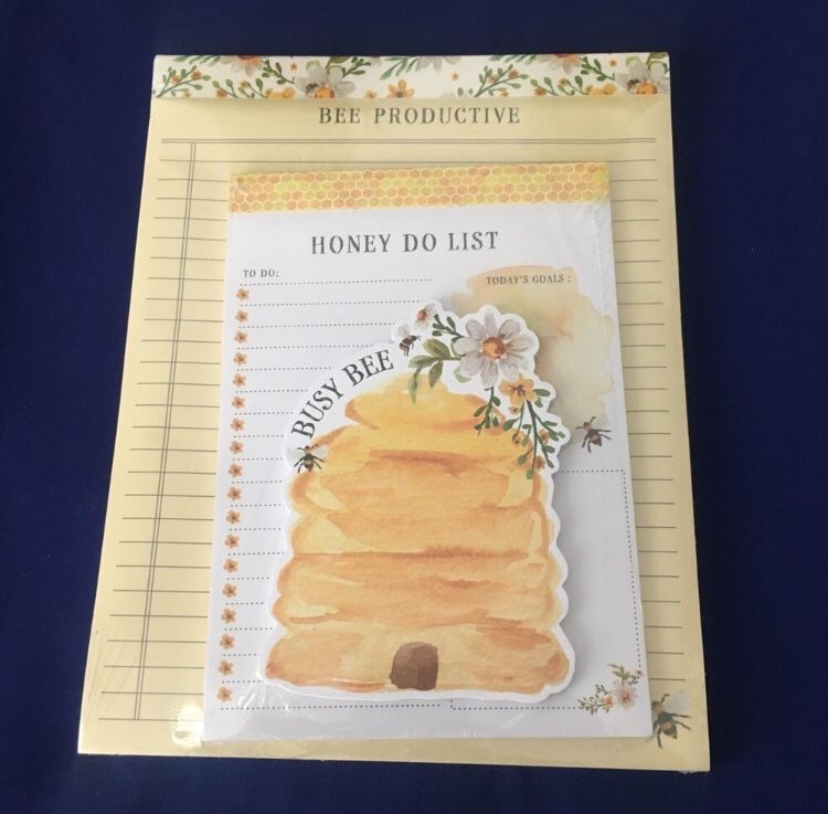 NEW Bumblebee Notepad Set Details: - trendy notepads - 3pc. Set: large standard notepad, medium notepad and novelty beehive pad - bumblebee / honeybee themed - large & medium pads have perforated pages - text on large notepad reads “bee productive” - text on medium notepad reads “honey do list” - medium list pad / notepad has 3 sections - small novelty pad reads “busy bee” & features a darling illustration of beehive, florals, and honey bee back to school ~ office supplies