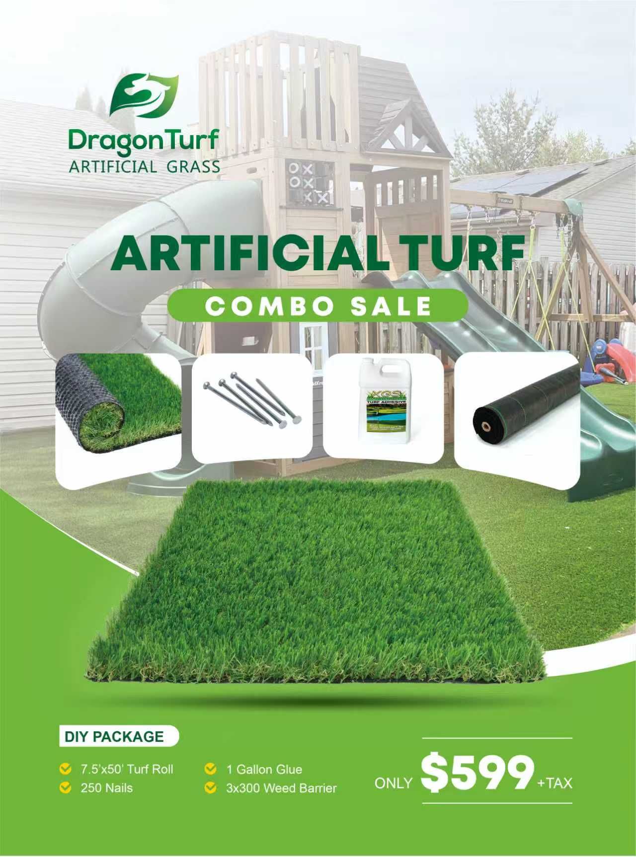 English – Transform your yard with DragonTurf’s Artificial Turf Combo Sale DIY Package—everything you need for a fast, easy installation. This all-in-one kit includes a 7.5’ x 50’ roll of artificial turf, 250 nails, 1 gallon of turf glue, and a 3’ x 300’ weed barrier. Perfect for homeowners who want beautiful, low-maintenance artificial grass, this package makes it simple to create a clean, green space that stays durable year-round. Whether you call it synthetic grass, Astro Turf, or fake grass, DragonTurf delivers quality and value you can trust—all for only $599 + tax. Español – Transforme su patio con el Paquete DIY de Oferta Combo de Césped Artificial de DragonTurf—todo lo que necesita para una instalación rápida y sencilla. Este kit completo incluye un rollo de césped artificial de 7.5’ x 50’, 250 clavos, 1 galón de pegamento y una malla antihierbas de 3’ x 300’. Perfecto para dueños de casa que buscan un pasto sintético atractivo y de bajo mantenimiento, este paquete le permite crear un espacio verde, limpio y duradero durante todo el año. Ya sea que lo llame césped artificial, césped sintético, Astro Turf o pasto falso, DragonTurf le ofrece calidad y valor garantizado—todo por solo $599 + impuestos.