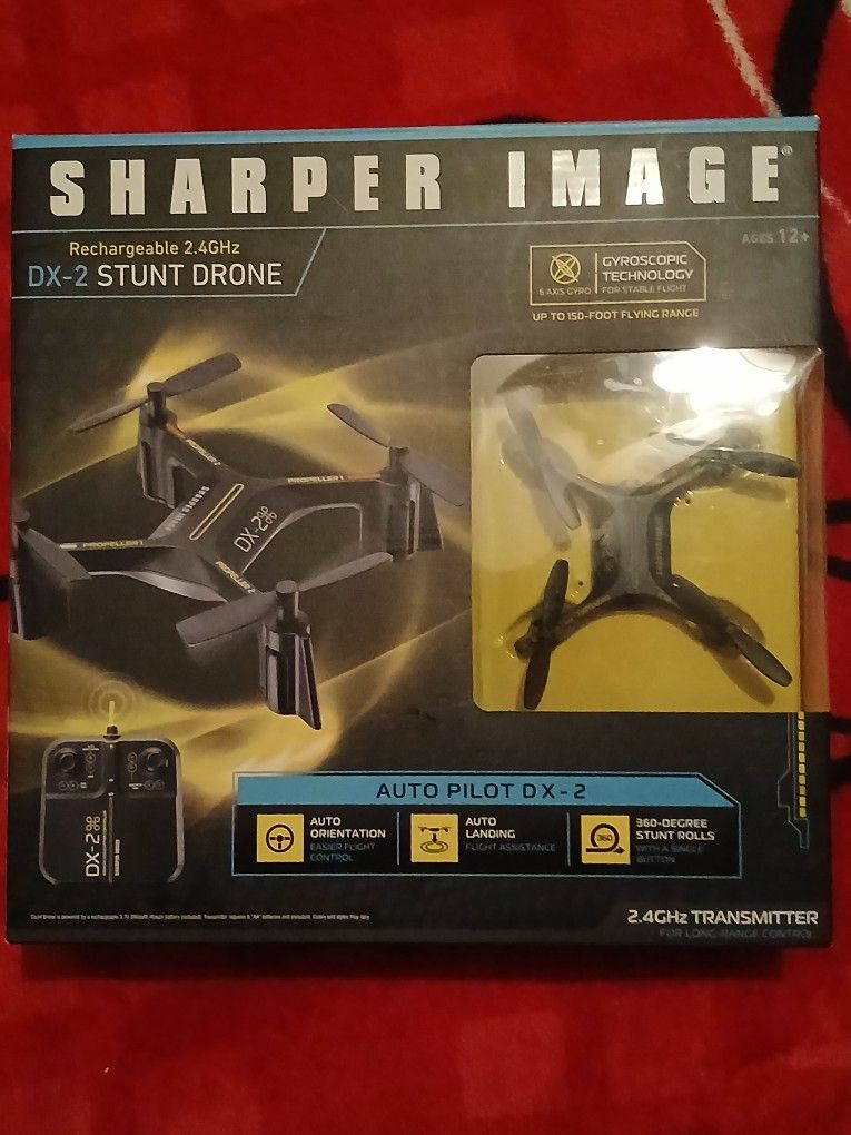 Up for sale is a Sharper Image DX-2 Rechargeable Stunt Drone. This is a great entry-level drone for kids (ages 12+) or beginners looking to practice their flight skills indoors or outdoors. Key Features: Stunt Mode: Performs 360-degree barrel rolls with a single button. Easy Flight: Features Auto-Orientation (Headless Mode) and Gyroscopic technology for very stable flight. Range: Up to a 150-foot flying range. Night Flight: Built-in LED lights make it easy to see in low light. Everything Included: Comes with the drone, 2.4GHz remote controller, USB charging cable, and the original box/manuals.