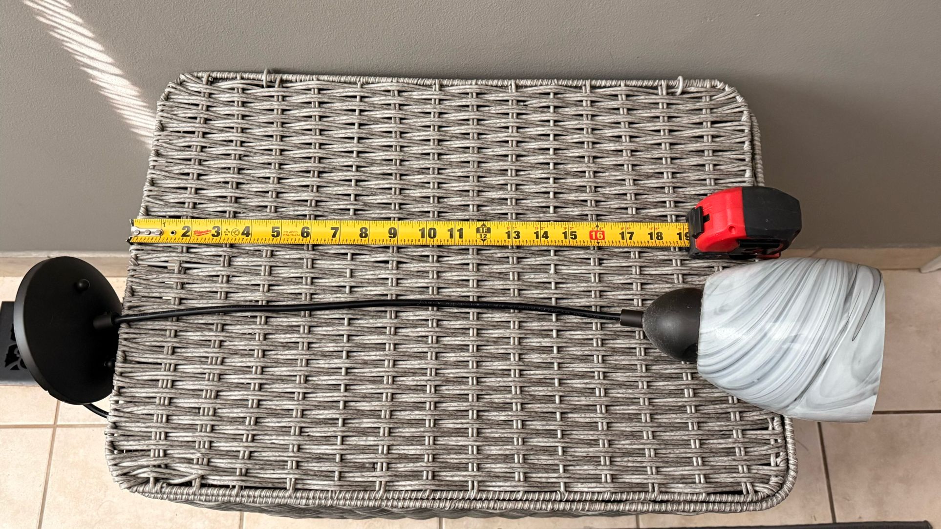 Used in the kitchen over the sink. It hangs about 17 inches. Works. Recently did a kitchen remod