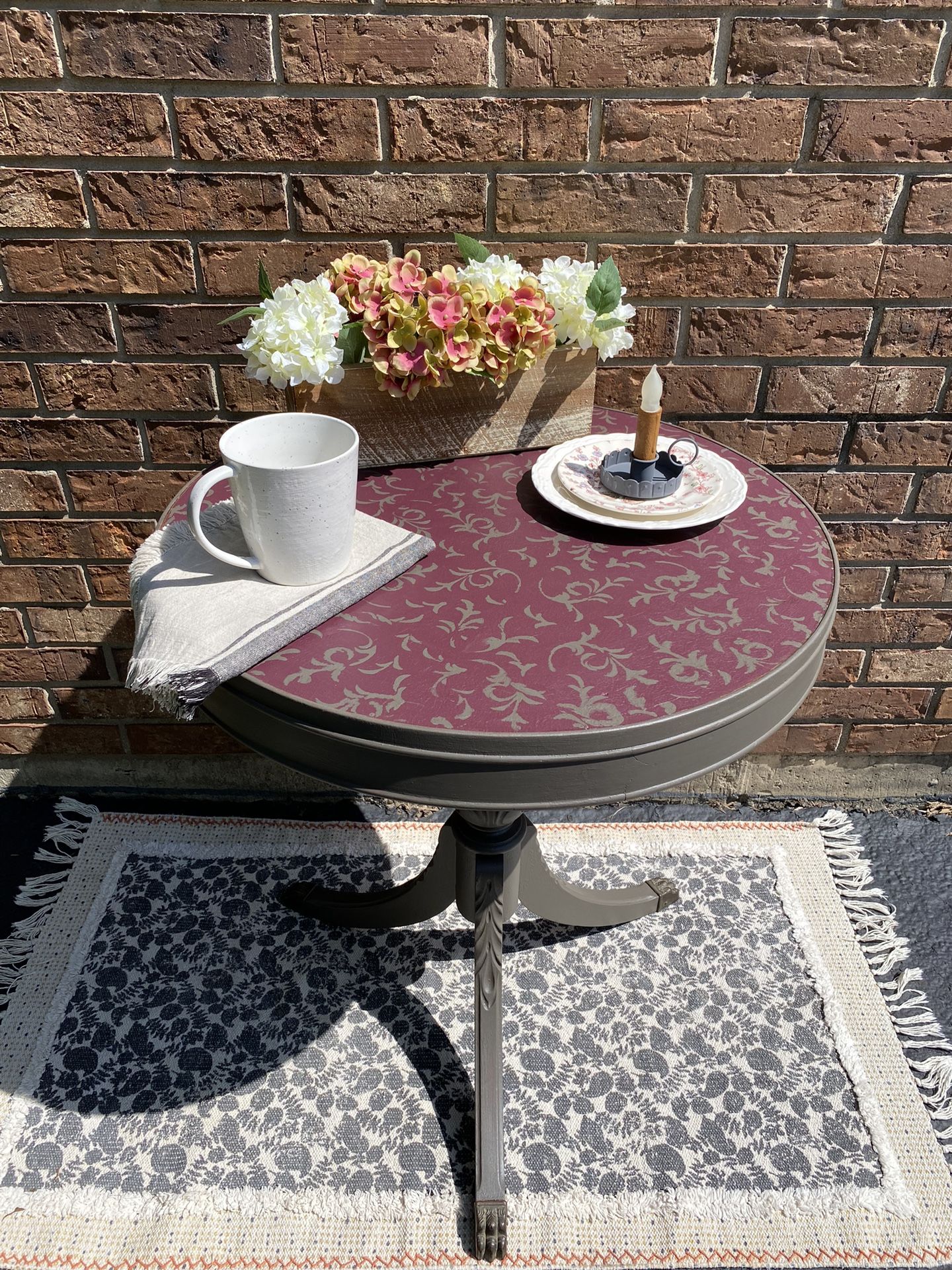 Unique Antique Drum Table. There is a small blemish on top of the table as seen in the last picture. I styled it a couple different ways to show it can easily be covered. The table does come with a removable round platform as shown in the second to last picture. 24” x 24” Round x 27 1/4” Tall