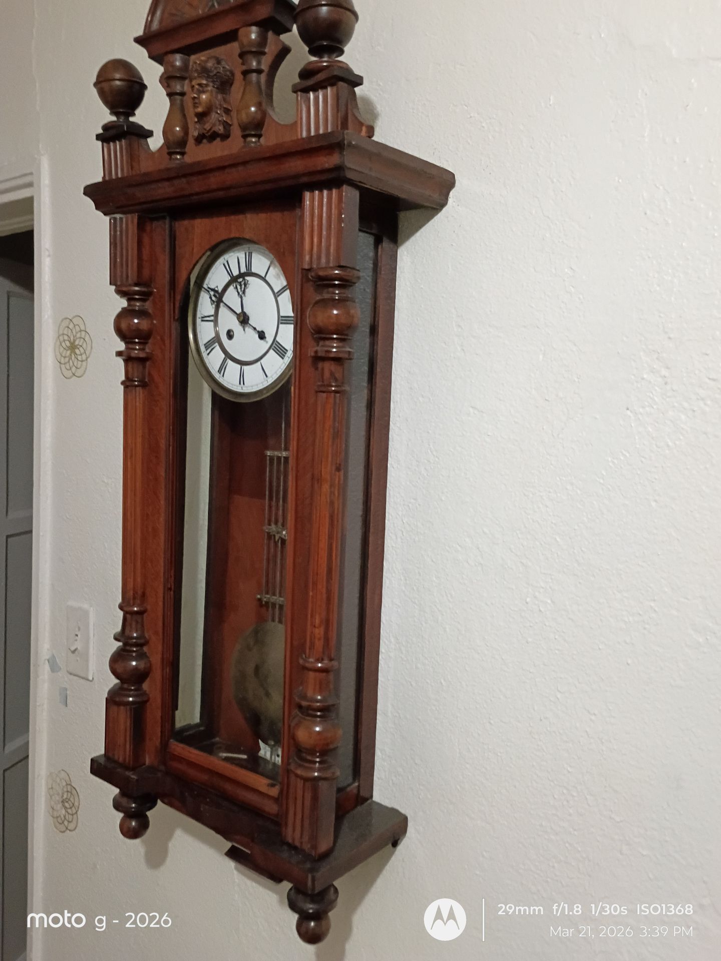 Wall clocks in mint condition Is from the late 19th century 1(contact info removed) traditionalcarved details fluted columns ornate finisls and a central carved mask or face on the top pendament