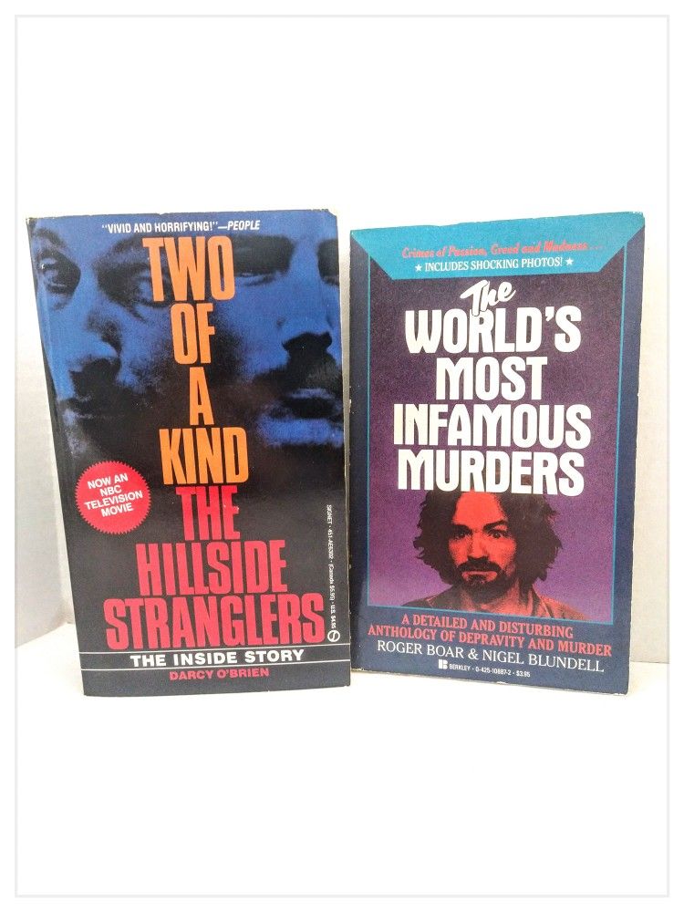* Excellent Pre-Owned Cond. * ** Set of 2 Books ** ☠️ from my Personal Collection of True Crime Novels and Research Books ☠️ ** NO Cover Damage ** ** NO Torn or Creased Pages ** ☠️ TRUE CRIME ☠️ Paperback ☠️ 1. Two Of A Kind: The Hillside Stranglers - The Inside Story (1st Edition - 1987) * author: Darcy O'Brien * 443 pages (including 8 pages of b&w pics) *** Angelo Buono & Kenneth Bianchi plunged the Los Angeles area into an unspeakable nightmare *** ☠️ TRUE CRIME ☠️ Paperback ☠️ 2. The World's Most Infamous Murders (2nd Edition - 1988) * author: Roger Boar & Nigel Blundell * 214 pages (w/various b&w pics throughout) ** Minor Crease in Spine ** *** A detailed and disturbing anthology of depravity and murder ** ☠️ These 2 books have been in my collection for over 35+ Years ☠️ ** From a CLEAN & SANITIZED, SMOKE & PET FREE Home! (2)