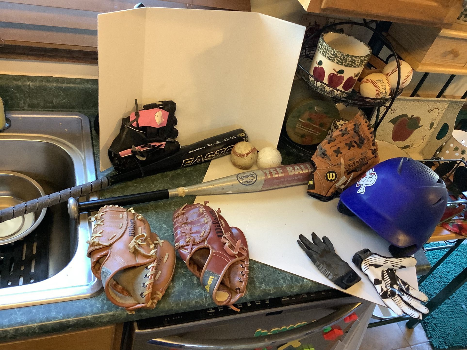 Huge Lot Of Kids Baseball Equipment Including 4 Baseball Gloves 2 Baseball Bats, Helmet Batting Gloves And Balls All One Price Will not separate All 11 items on very fair price Wilson glove size 10 Kirk Gibson model Wilson 9.5” glove Wilson 10” glove CHBS Hello kitty glove 9” Evoshield blue baseball helmet 6.5 to 6 3/4” Baseball tball bat Easton 26” 16 ounces Louisville Slugger tball bat 25” 16 ounces 3 batting gloves All one price Plainfield, Illinois