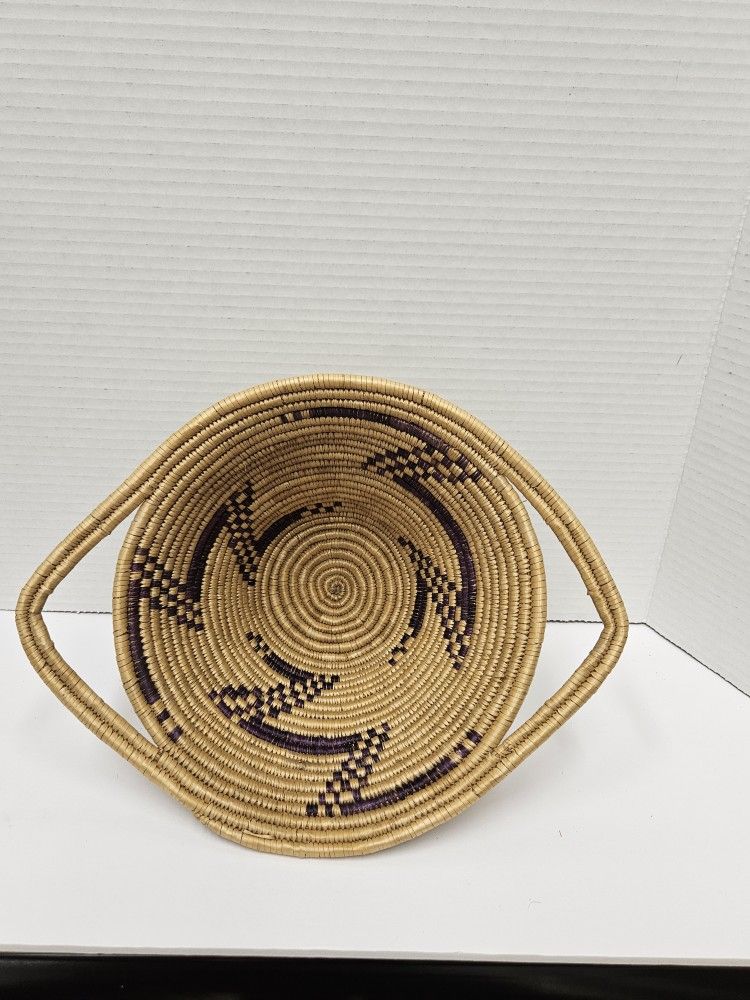 This handmade woven basket is a round storage basket made from wood with a woven pattern. It is suitable for all occasions and can be used in any room. The basket has a handle for easy transport and is original, crafted in the United States in the late 20th century. With its vintage charm and unique production technique, this basket is a decorative and functional collectible perfect for adults looking to add a touch of handmade craftsmanship to their home.