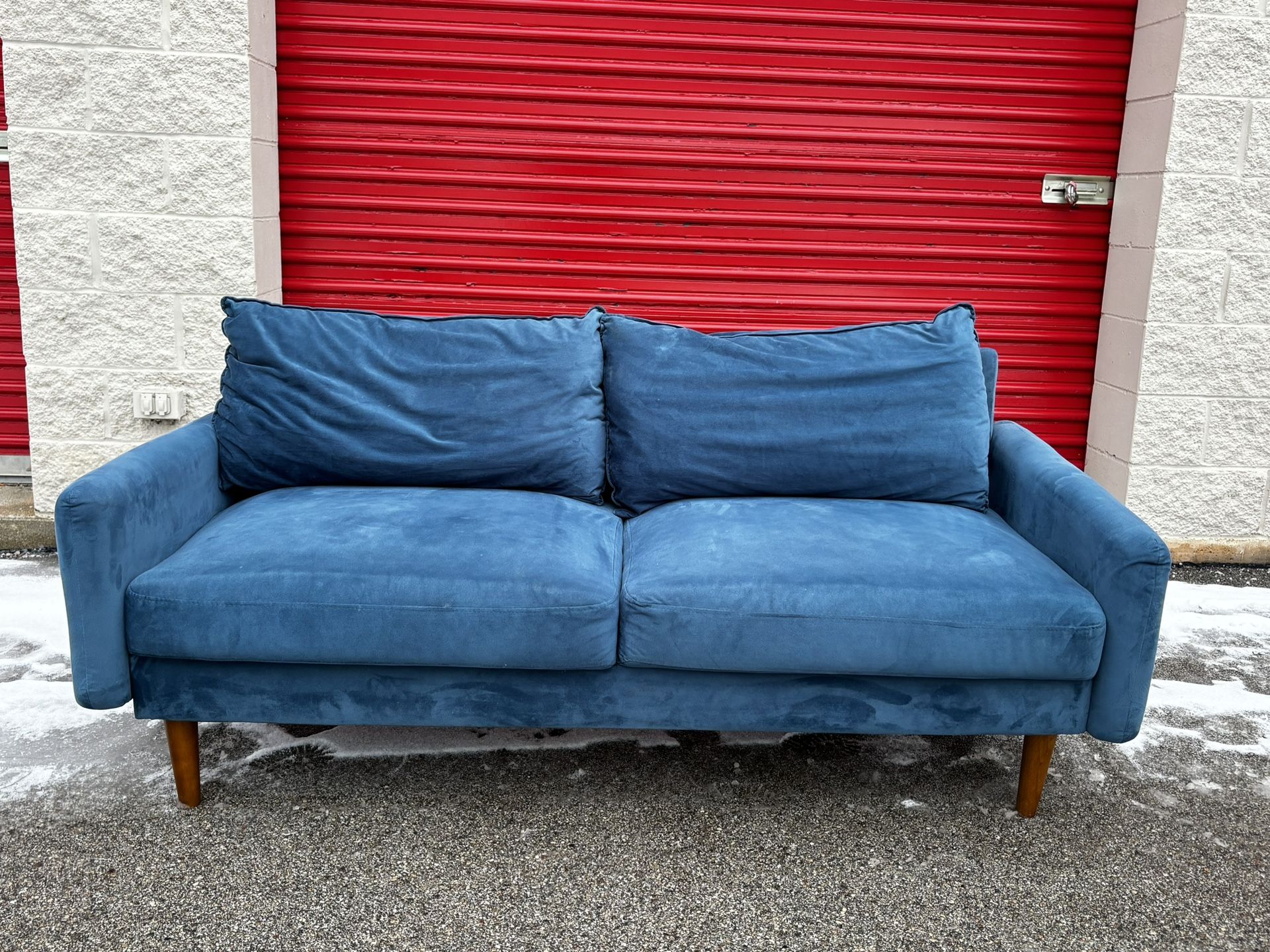 Beautiful modern blue velvet sofa in excellent condition. Super comfortable with deep cushions and clean mid-century style wooden legs. Perfect for apartments, condos, living rooms, or offices. This couch has been fully cleaned and vacuumed Smoke free and pet free π« FREE CURBSIDE AND SAME DAY DELIVERY π get $50 off if you come pick it up Need help to bring it in ? We can help for a small fee Payment options: Zelle , Venmo , cash app , Apple Pay and cash