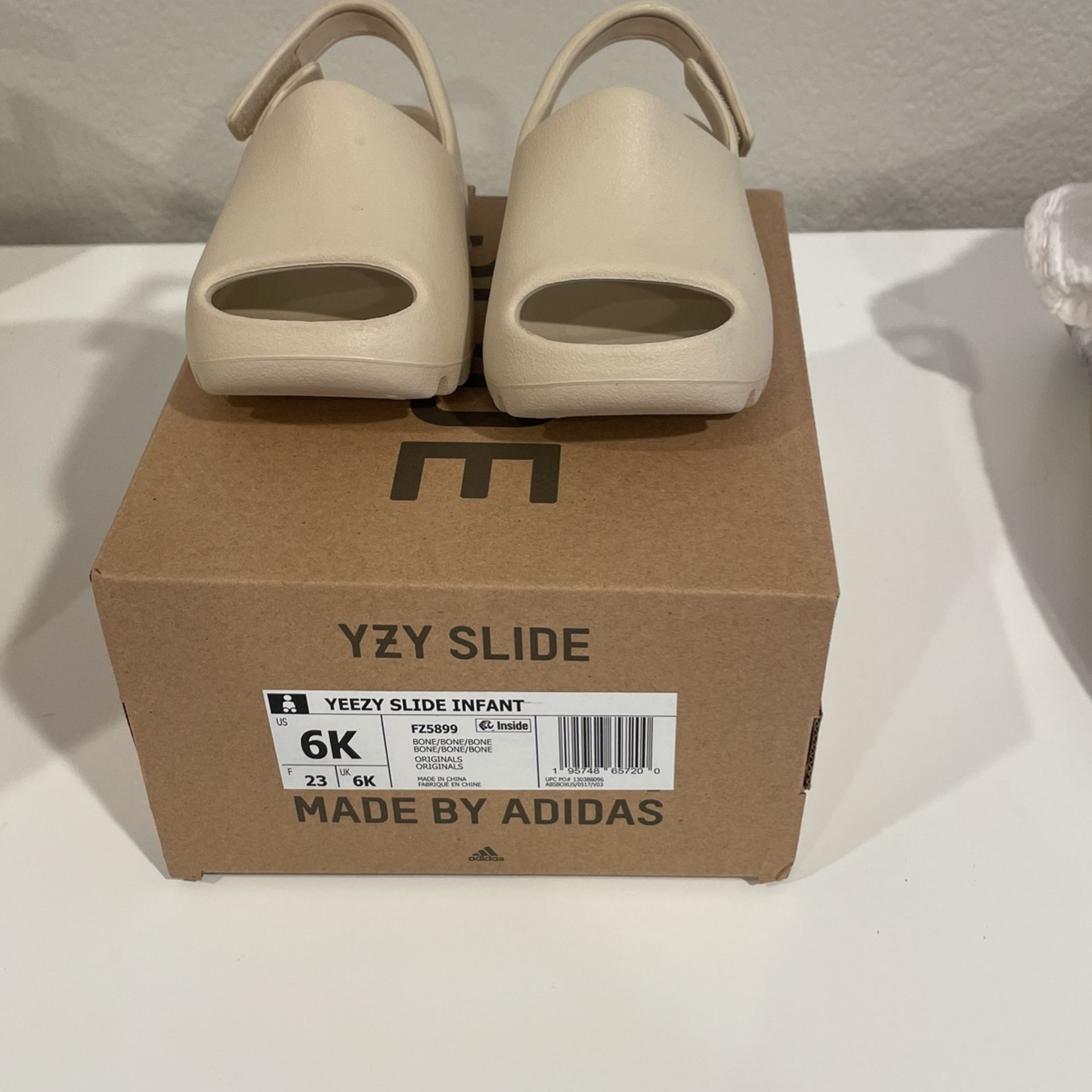 Yeezy beige infant slides 6K ( put on a 4k child) Runs small It never fit my daughter to wear because they ran small by the time she was a 6k