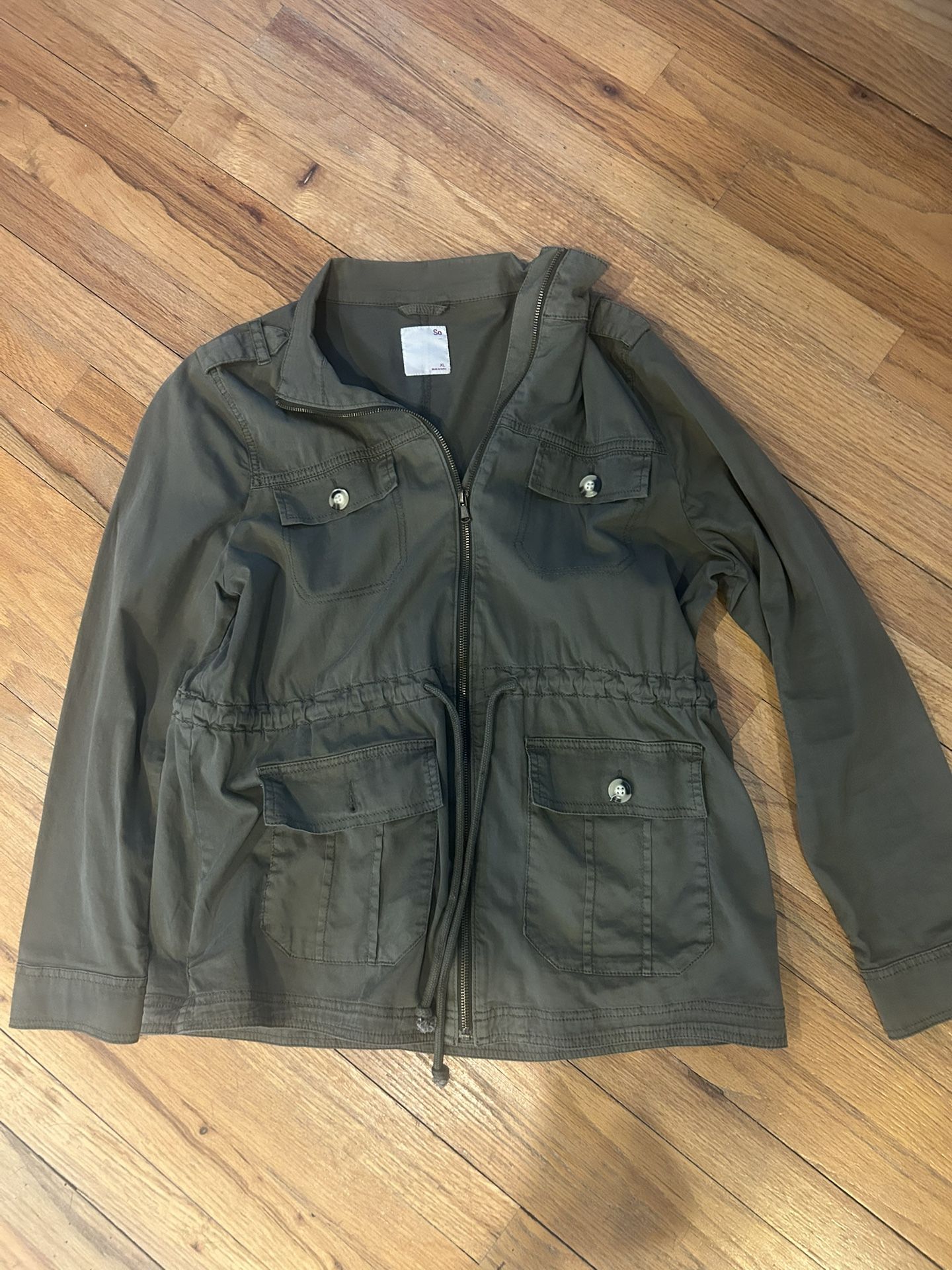 Women's Olive green utility jacket with adjustable waist and pockets size XL