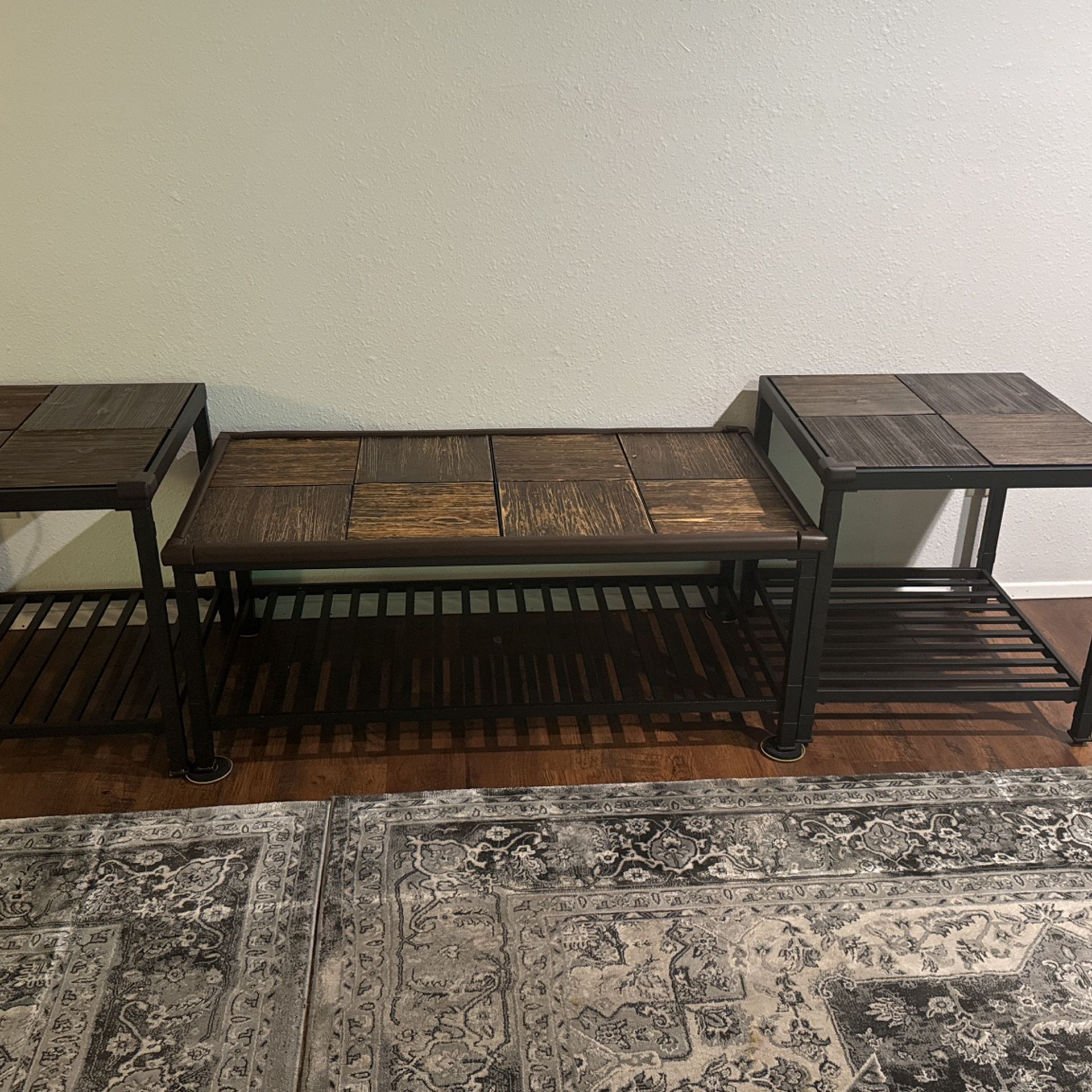 Lamerge 3 Pieces Living Room Table Set, Industrial Coffee Table with 2 Square End Side Tables, Coffee Table Set with Metal Frame for Apartment Home Office, brown