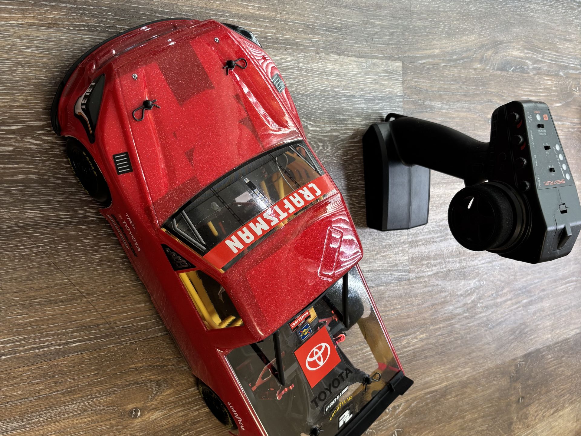 Losi 1/12 NASCAR RC Racecar This RC racecar features a Toyota Tundra body with a red pearl finish. Every component has been upgraded—receiver, transmitter, motor, ESC, and many more—too numerous to list individually. Comes with a battery included. Perfect for collectors. Brand new condition. $400 cash Traxxas, arrma, Losi, tamiya