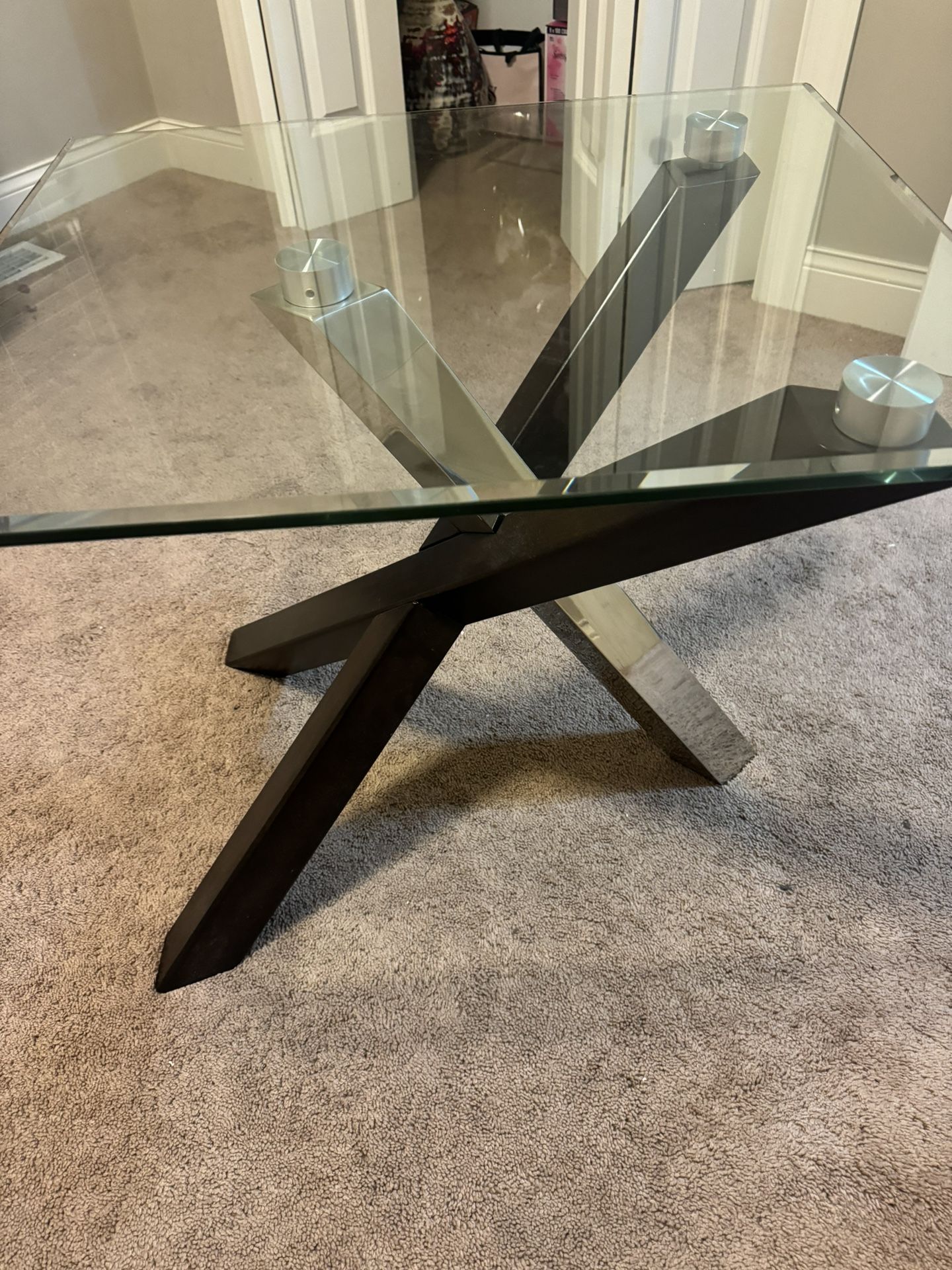 Really good conditions had to get rid of because I got new couches and they too long. Wood and metal cross legs glass top 22x26