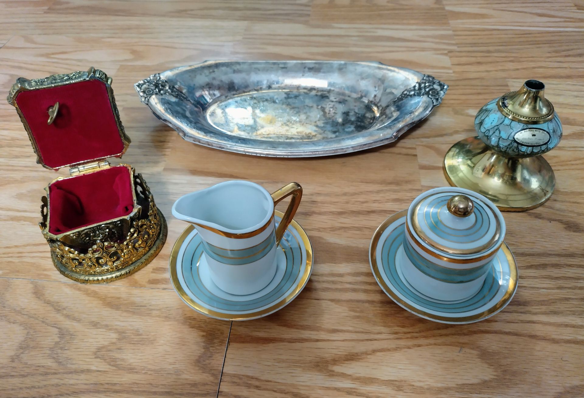 Trinkets lot, Wilcox silver co, silver plated bread pan. Brass candle holder? aqua and gold rimmed tea set, stamped made in Japan, brass princess ring music box stamped made in Japan, heavy for its size. Selling everything shown here in a lot for $55. Pickup only available in Cleburne, Tx.