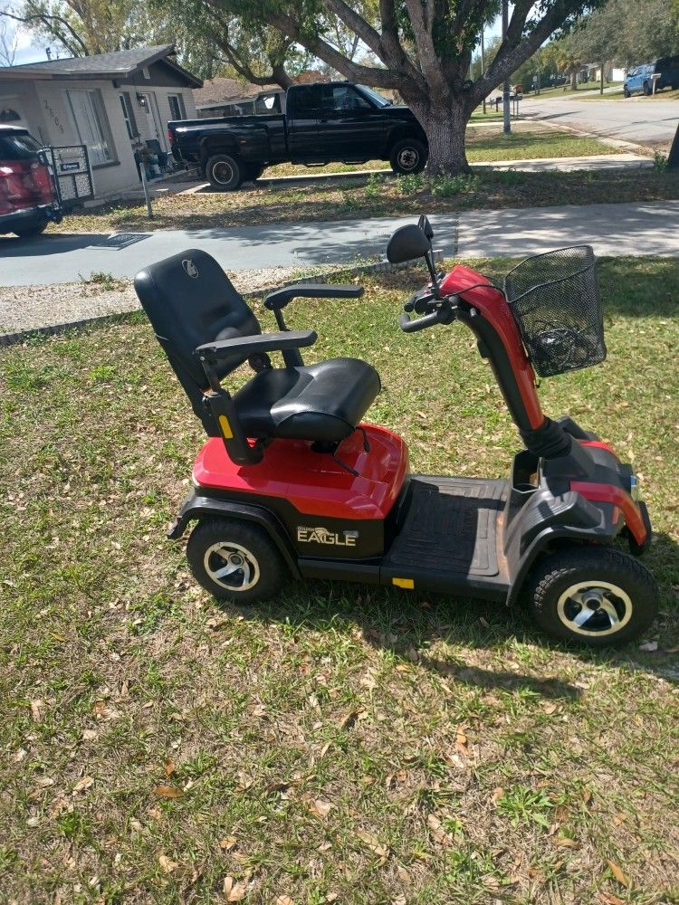 Golden Eagle Mobility Scooter 4 wheel spring suspension. Pneumatic tires. Weight capacity 450 lbs. Recent batteries. Charger. Front basket .mirrors. headlight and taillights. Seat has gel typecushion foreasiersitting. Overall good condition. It can be yours today for only 550.00. Sorry but no deliveries