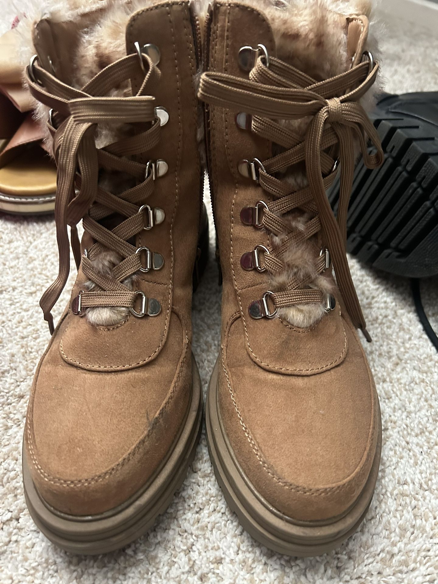 Sun + Stone Orlaa faux leather cold weather combat and lace-up boots in a tan color with a faux fur collar and tongue.