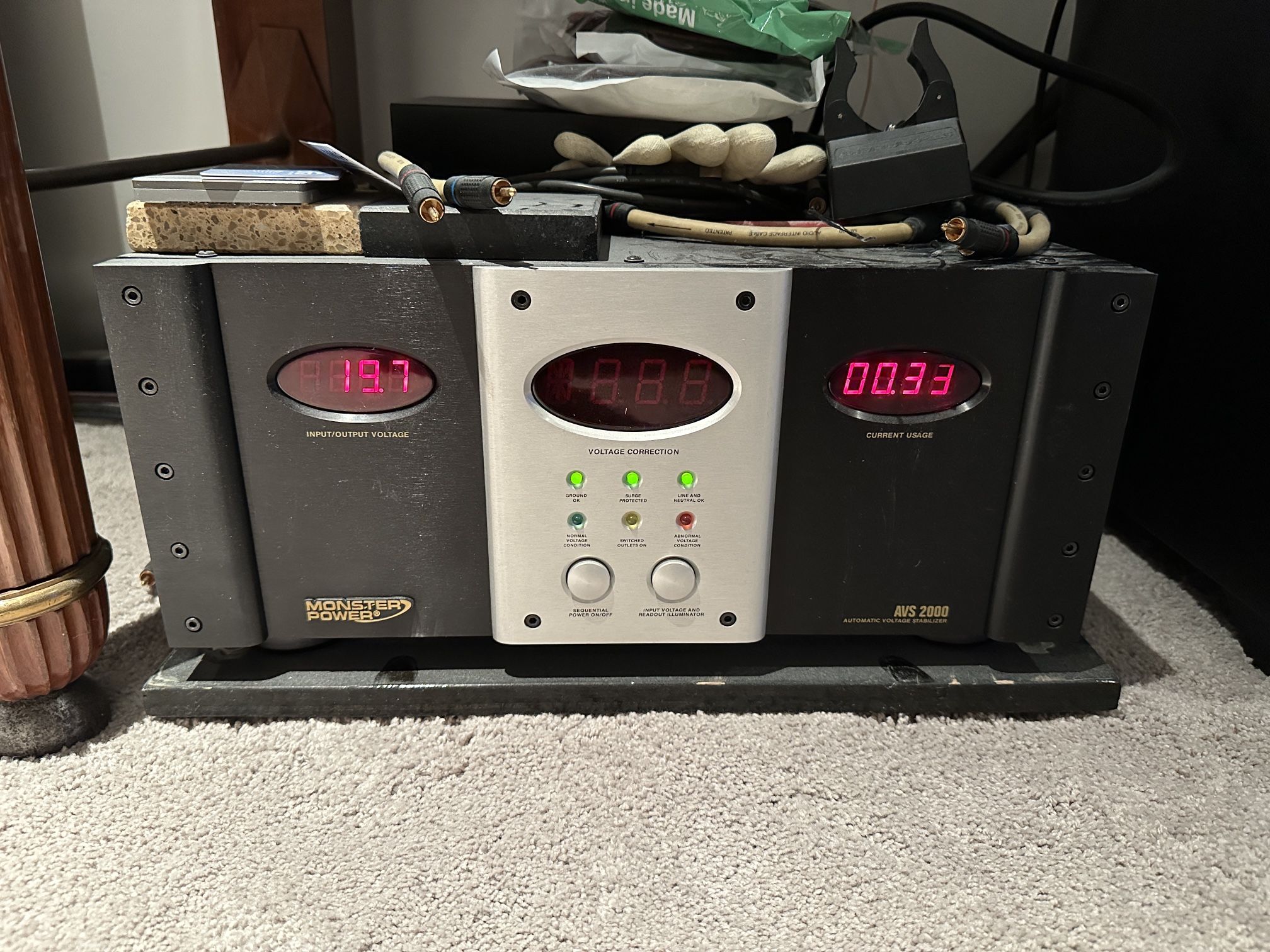 Selling my monster AVS2000 power conditioner filter surge protector power strip with 6 outlets. 2000v 15amp corrects voltage to 120v built in circuit breaker protection. Has built in ground to chassis ground your audiophile hifi equipment.