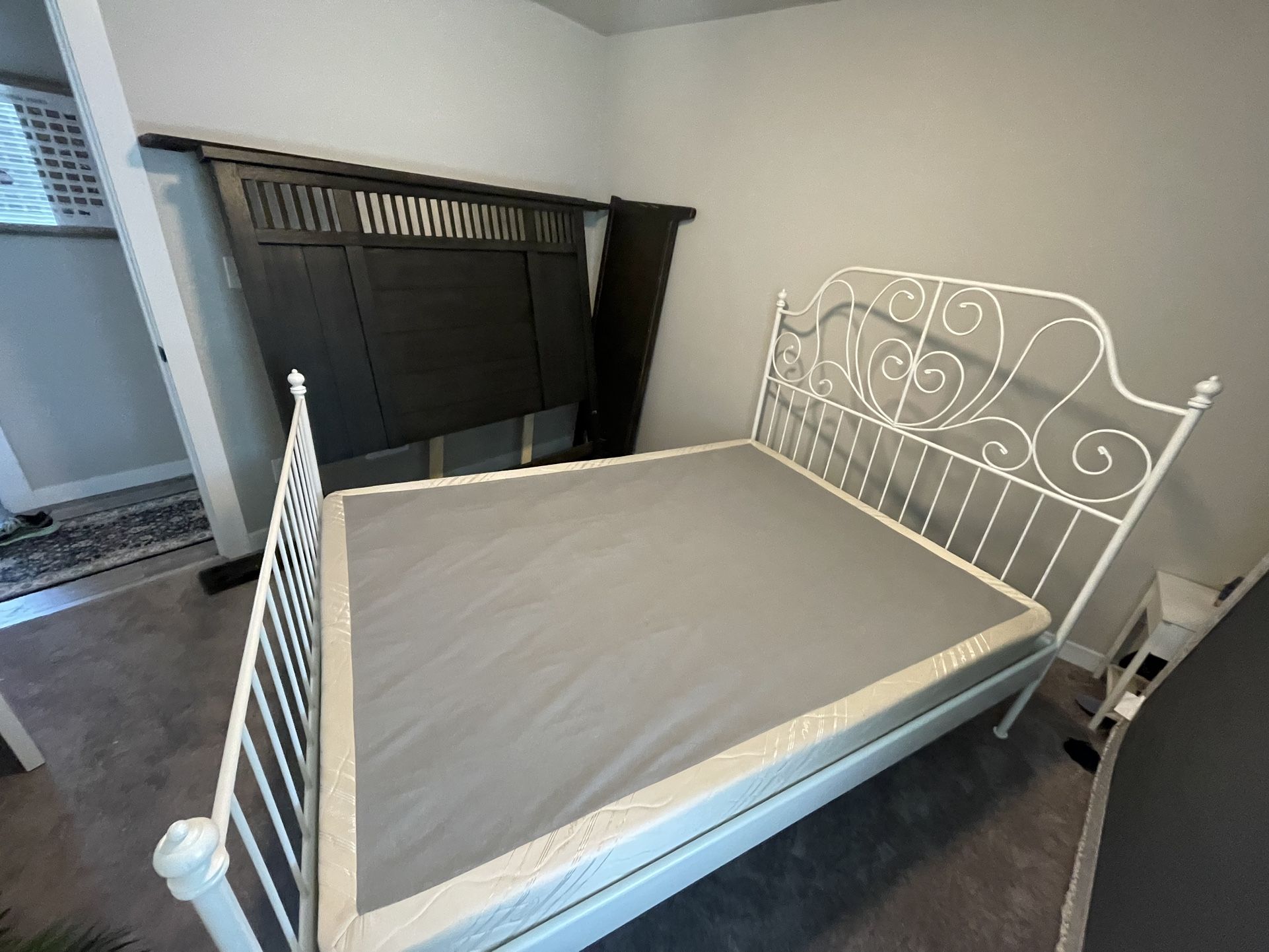 White bed frame, ikea. Frame and box spring only. Mattress not included. Squeaks but is in good condition. Comes in many pieces. Box spring included if you want it. Didn’t come with any slats, so you have to use a box spring with it or get your own slats. Pick up near Ralph’s thriftway.
