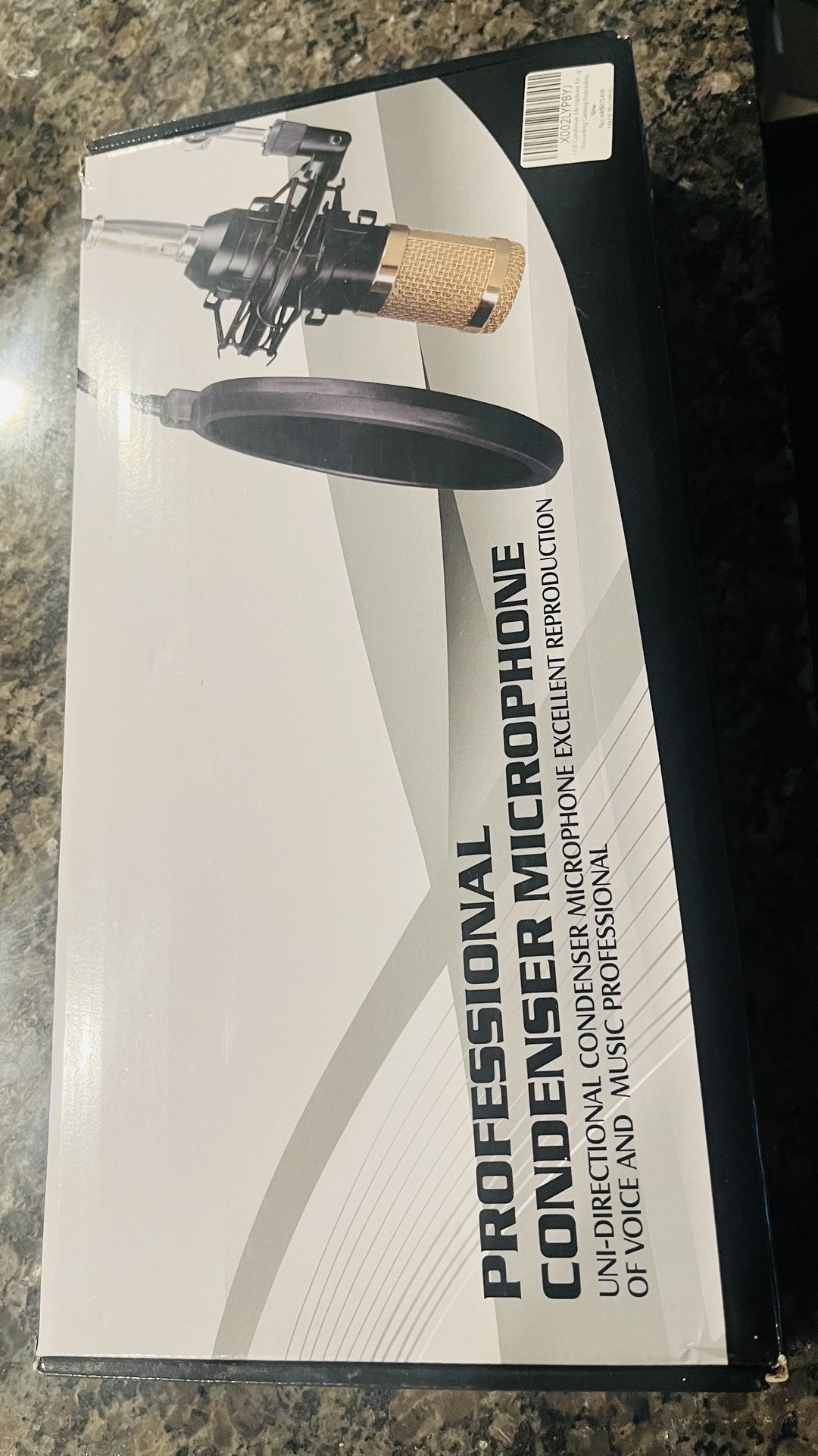 NEVER USED, Open Box. Uni directional condenser microphone excellent reproduction of voice and music professional. USB, full kit. GOOD for gaming and podcasts