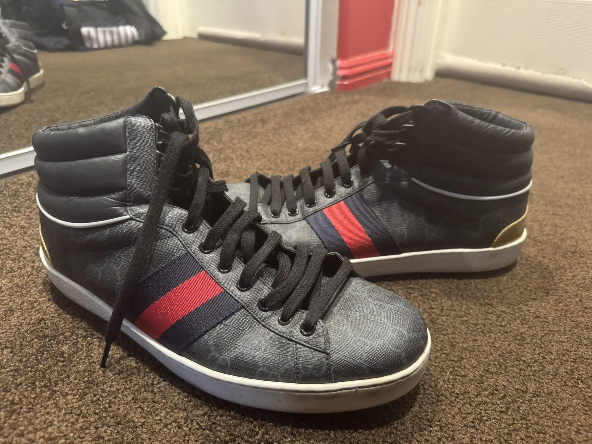 Authentic Gucci high-top sneakers in good used condition. Features signature GG monogram canvas, bold red and navy web stripes, and gold metallic leather heel tabs with “GUCCI” branding. Padded ankle support and leather interior for comfort. Minor wear on the soles, uppers in solid shape. Stylish and hard to find in this colorway.