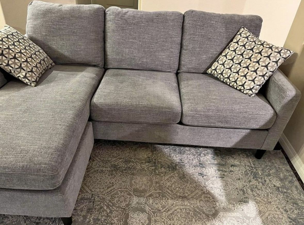 Soft Linen Fabric, Comfortable Cushions, Reversible Chaise, & Removable Covers. Excellent Shape, Original Condition, & Clean. Made by Living Spaces. Pickup in 92109 or Additional Delivery Available. Dimensions: 80in Width, 62in Chaise, 34in Depth, 19in Seat, 37in Height.