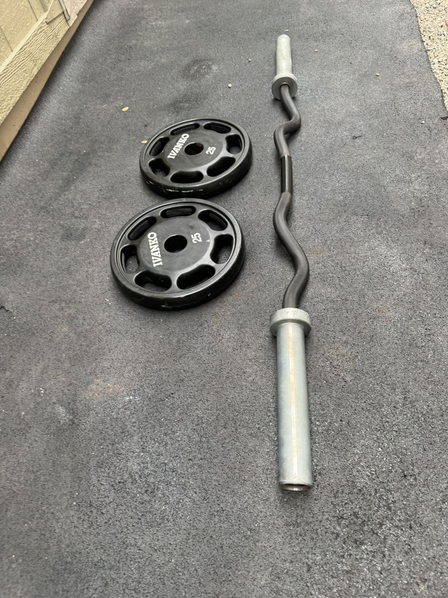 ROGUE CURL BAR AND IVANKO 35 lbs pair ivanko weight plates