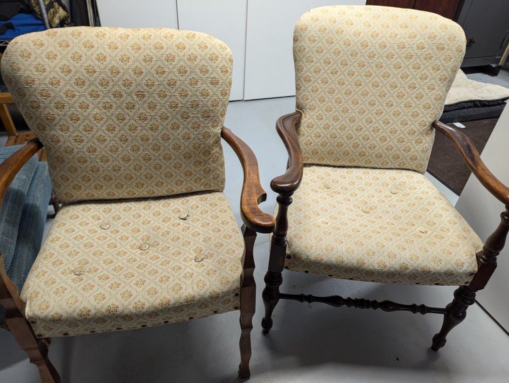 Two vintage armchairs. Both sturdy. Wooden arms and legs. Upholstered seat and back.