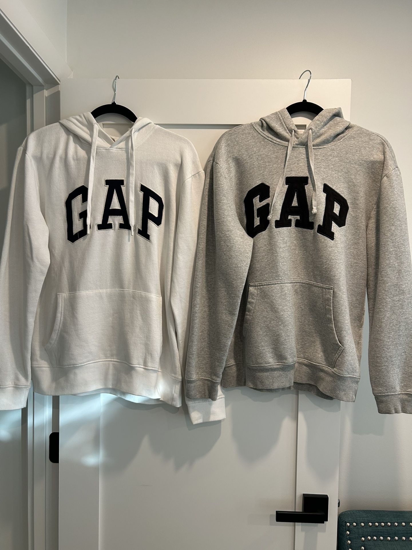 Selling 2 Gap mens medium sweaters White hoodie with Navy Blue letters selling for $6 in great condition only used twice. Gray hoodie with black letters, Selling for $4 has 2 small stains on the back of the sweater. (See picture) Take both for $8