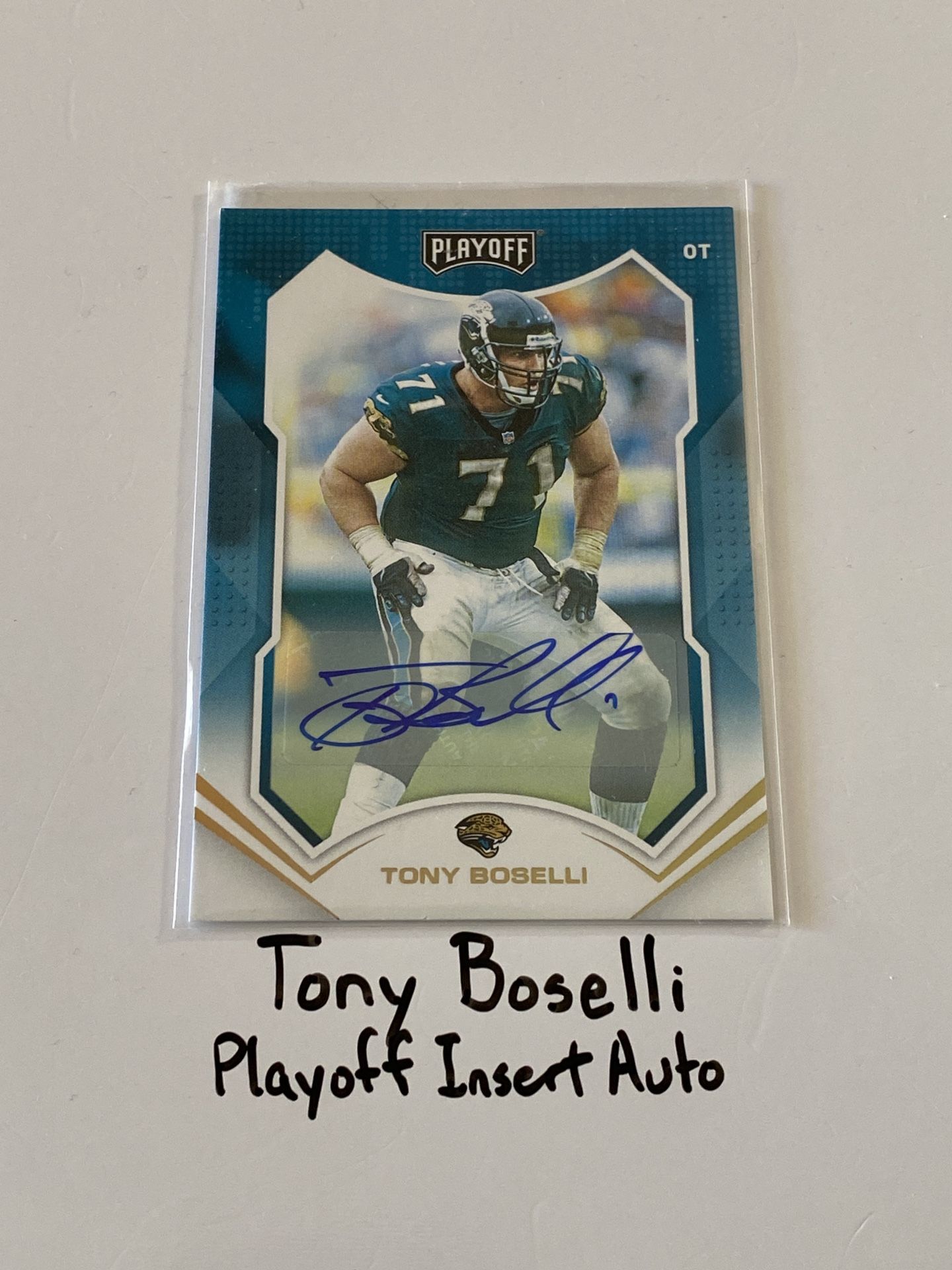2021 Panini Playoff Short Print Autograph Insert Card of Jaguars Hall of Fame Tackle Tony Boselli. The authenticity of this signature is guaranteed by Panini America,Inc. Local pick up only. Price firm. LISTING #50.