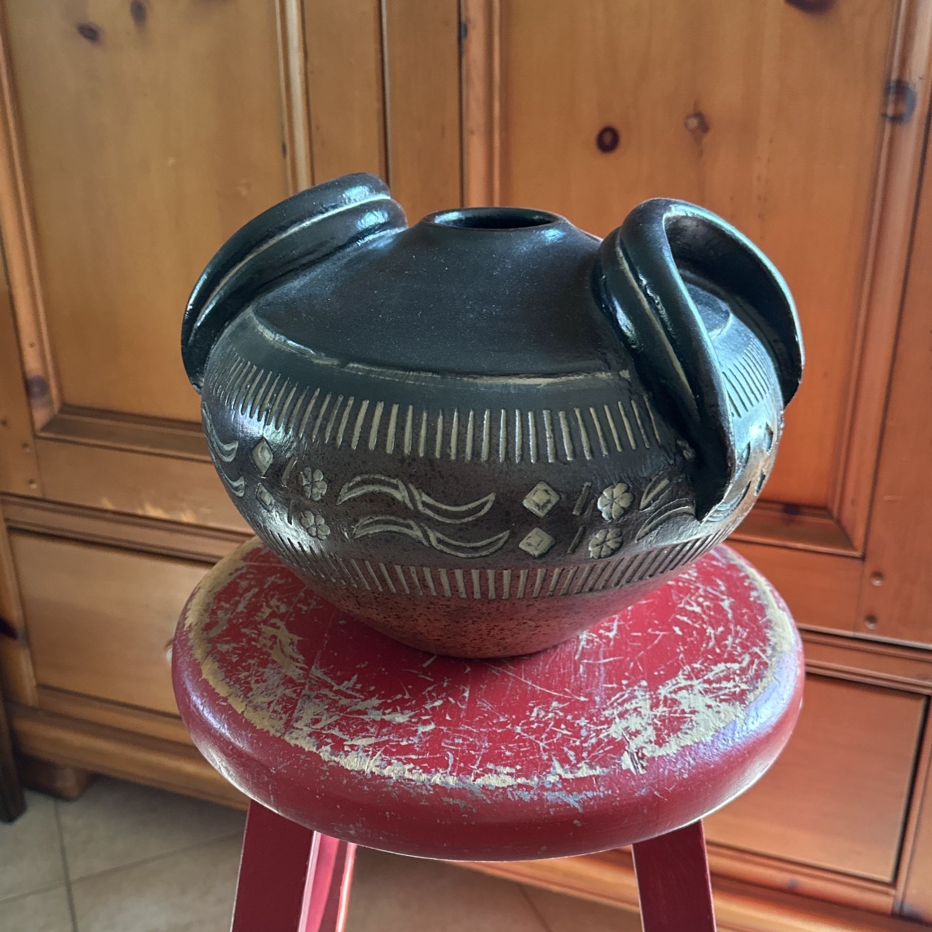 PIER 1 Mexican Style Vase Pot Deco Chip on handle. Never see when you turn to the back.