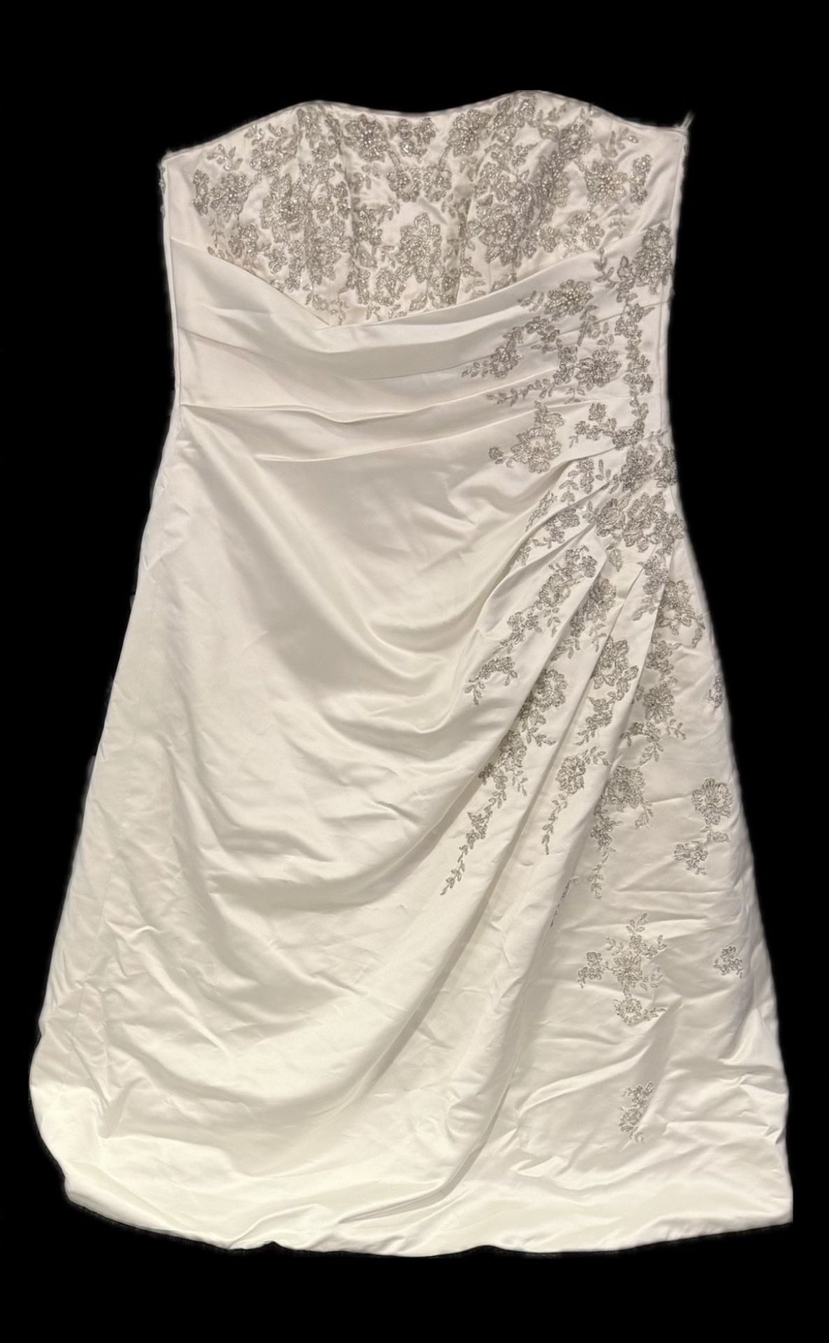 David's Bridal Wedding Dress + Tiara Bundle Beautiful David's Bridal A-line wedding gown in size 18 with elegant beaded/silver detailing and a gorgeous long train. Flattering silhouette with detailed embroidery throughout and includes matching bridal tiara for the full bridal look. Perfect for weddings, bridal photoshoots, formal events, quince, or pageants. Dress is in great condition and just needs steaming from storage.