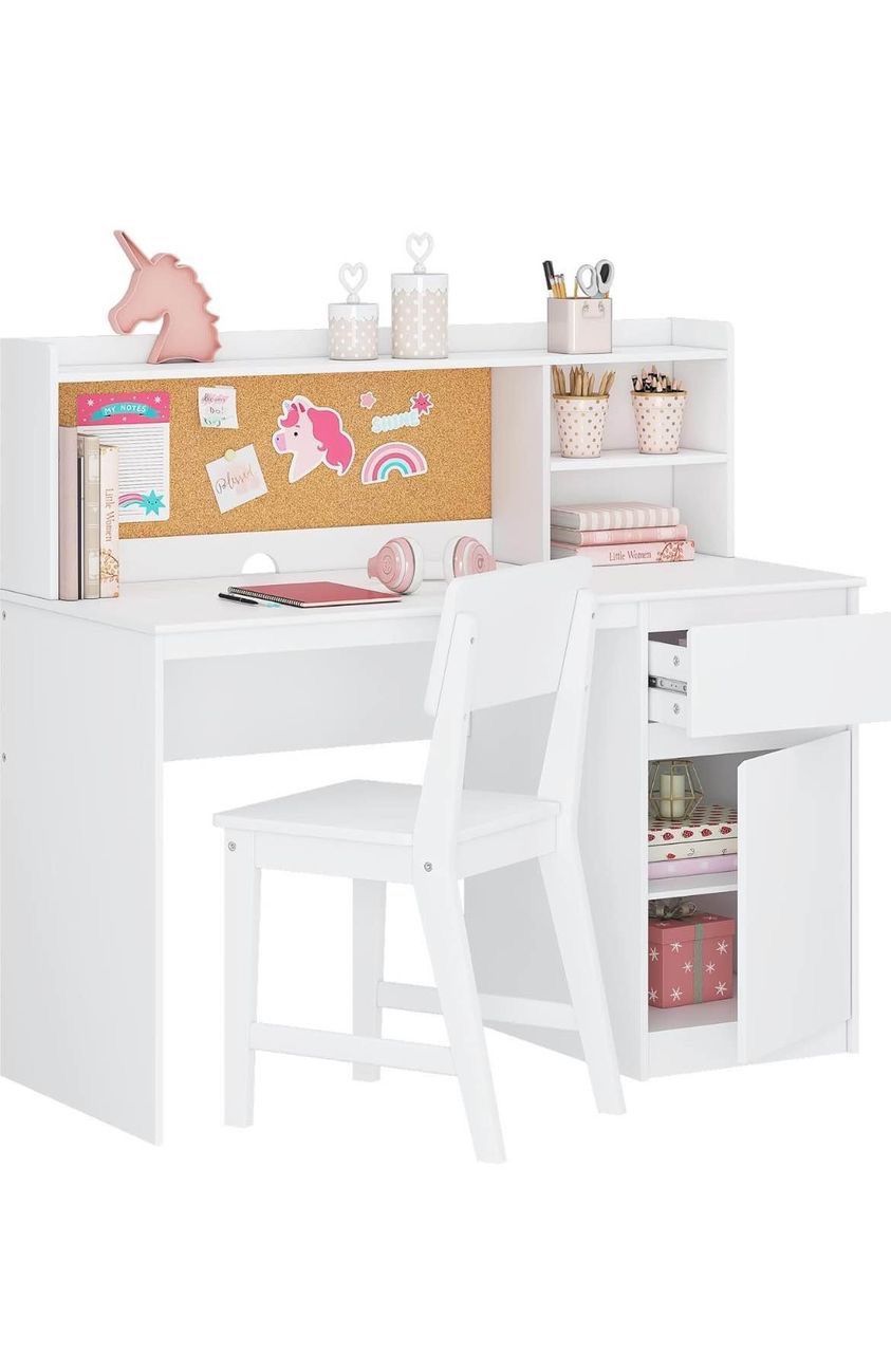 White Kids Study Desk with Chair, Kids Desk and Chair Sets with Hutch and Storage Cabinet