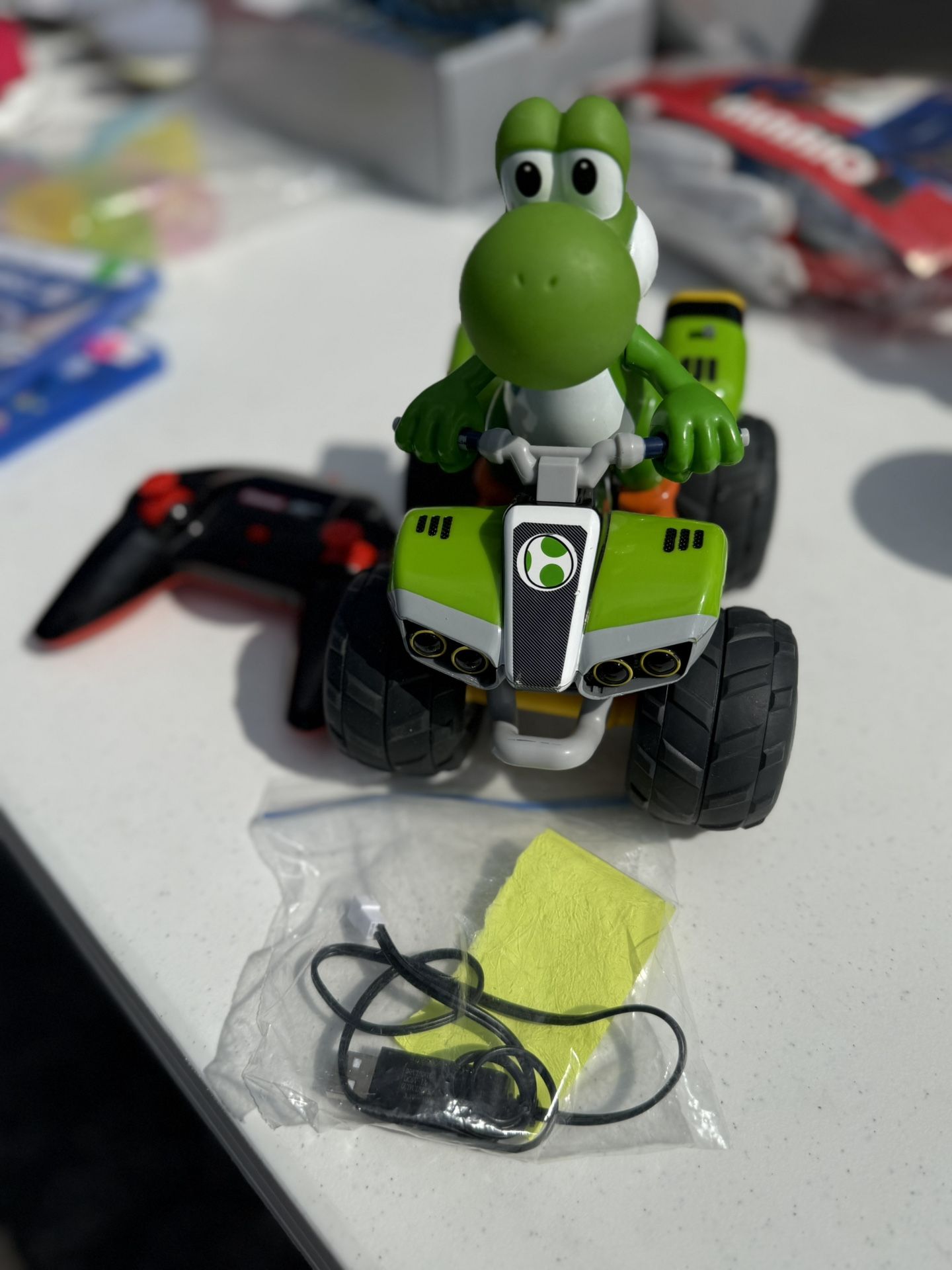 Yoshi remote control quad car $40 Carrera RC 200997X Nintendo Mario Kart 2.4 GHz Radio Remote Control Toy Car Vehicle - Yoshi Quad Official Licensed Nintendo Mario Kart Product Differential gear and pneumatic tires for better handling LiFePO4 rechargeable battery for longer running time and less charging Ready to run includes all vehicle and controller batteries