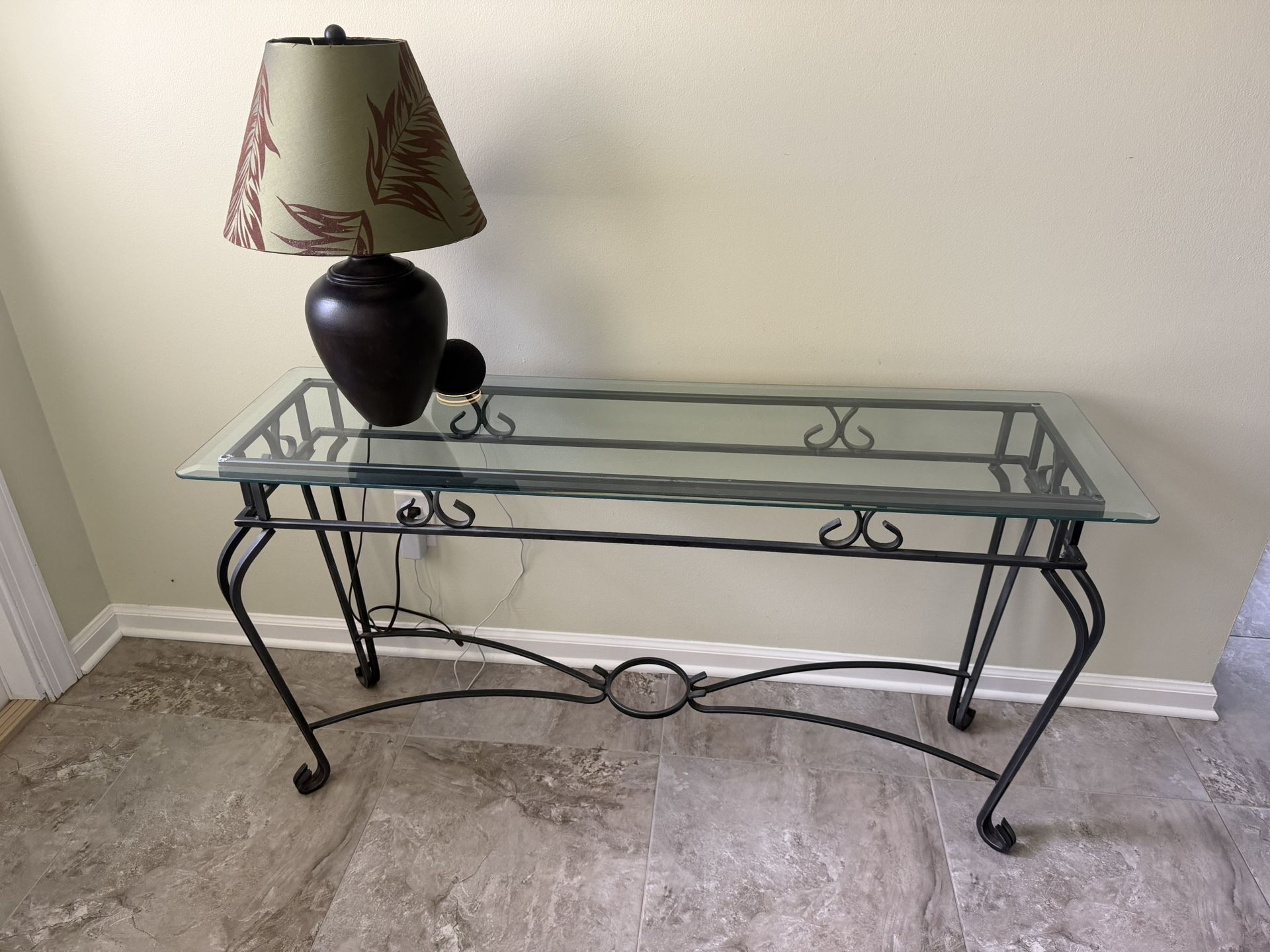 Wrought Iron & Glass Console / Sofa Table Elegant and sturdy console table with a classic look! Great condition. Features include: • Wrought iron base with decorative scrollwork detailing • Thick beveled glass top • Curved legs with scroll feet • Ornamental center stretcher bar for added stability and style • Dark matte black/charcoal iron finish Versatile piece that works beautifully as an entryway table, sofa table, or hallway console. The glass top keeps it feeling light and airy while the iron base adds great visual interest. 53” long x 16” wide x 27.5” tall Lamp shown in photos is NOT included — table only. Local pickup only. Cash or Zelle accepted. DM with any questions!