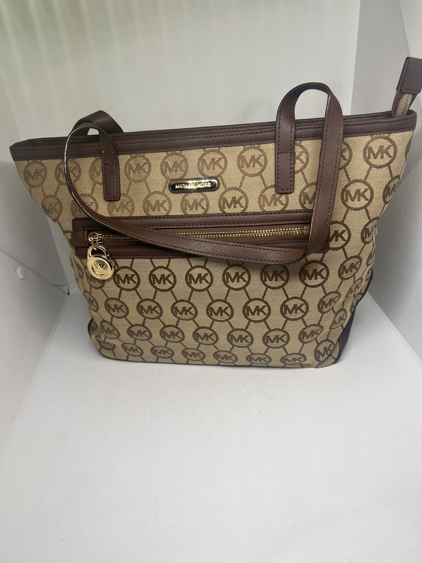 Michael Kors Vintage-Rare Signature Saffiano Leather Bag PreLoved reflect light use. Approximate Measurements: 15”L x 5.25”W x 9”H Double Handles Straps 9”L Colors: Brown Materials: Signature Canvas/Saffiano Leather Good-Tone Hardware Features: Gold-Tone Padlock Exterior Front Zipper Pocket Top Zipper Closure Interior Signature Tan Fabric Lining Interior (4) Slip Pockets (1) Zipper Pocket Please refer to all the photos for details. We are quick shippers. Questions are welcomed. Thank you for shopping on our closet. Bundle and Save!