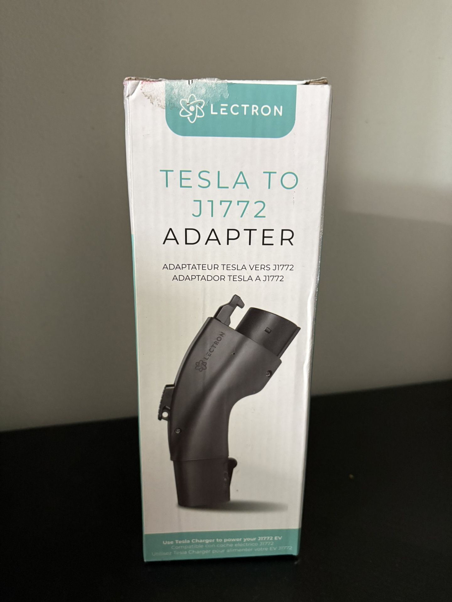 Handy Lectron Tesla to J1772 adapter for your EV. Use Tesla chargers to power up your J1772 EV. Compatible with all J1772 EVs. Max 48A and 250V AC. Super compact and easy to carry. Comes with a little pouch too.