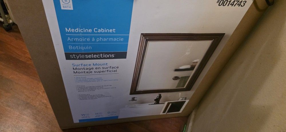 Brand new in sealed box. allen + roth fog-free surface mount espresso mirrored medicine cabinet. It features a dark brown, picture-frame-style exterior trim and a soft-close door mechanism.