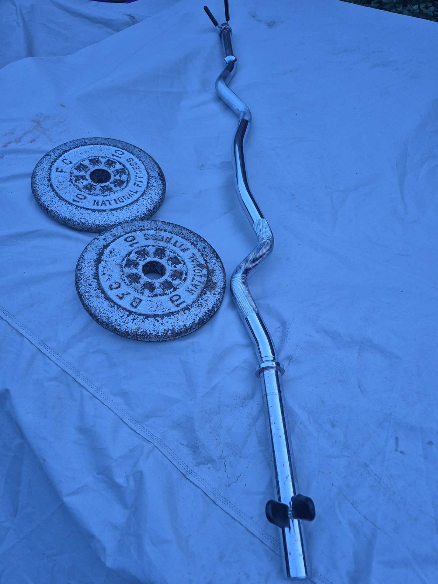 Curl Bar N two 10lbs weights 1 inch diameter hole