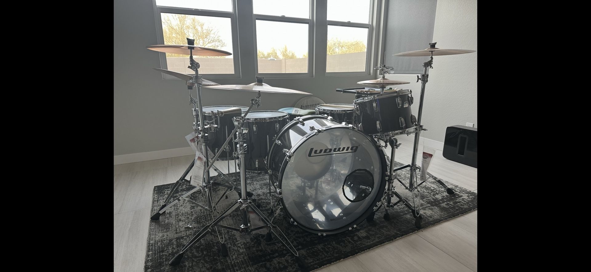 Excellent condition Ludwig Vistalite drums with Black beauty snare, Paiste 2002 cymbals and all atlas pro hardware. Used but zero damage. 17” hi hats, 24” ride, 16 and 18” crash and 20” china. Drums only $3500