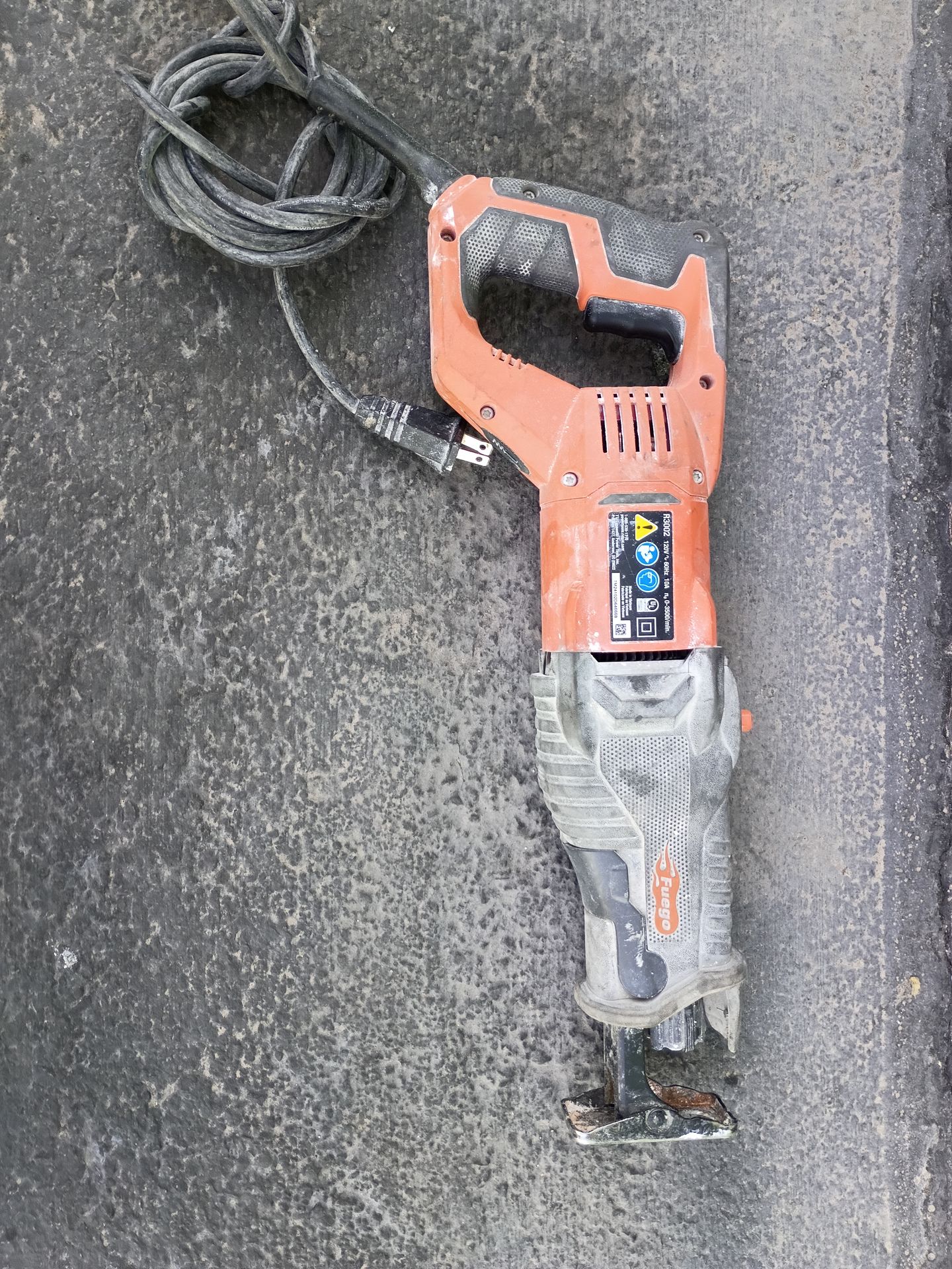 The Ridgid 10-Amp Fuego Orbital Reciprocating Saw is a corded electric saw that is designed for cutting wood, plastic, and metal. It has a 10-amp motor, a 3/4-in stroke length, and a maximum speed of 3500 OPM. It also has a tool-free adjustable, pivoting shoe and an orbital action switch. Used