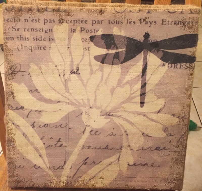 This is a beautiful natural dragonfly painting done on burlap. Bought at Kirkland's. I just never put them up. Still has the original price stickers on it of $19.99. 15" x 15". It is $15.00 for one or you can buy this one and the matching butterfly for $25.00.