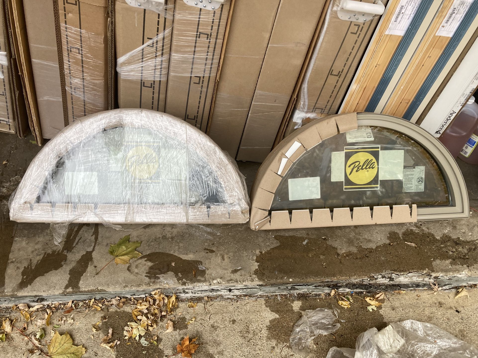 New Pella Lifestyle half moon windows, putty aluminum exterior , unfinished wood interior , no nail flange but can be ordered trough Pella , 29 by 14 1/2 . Both for $250